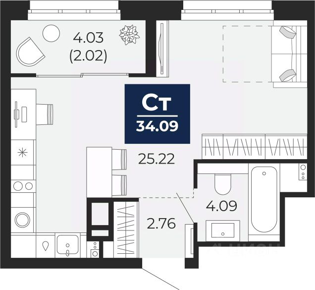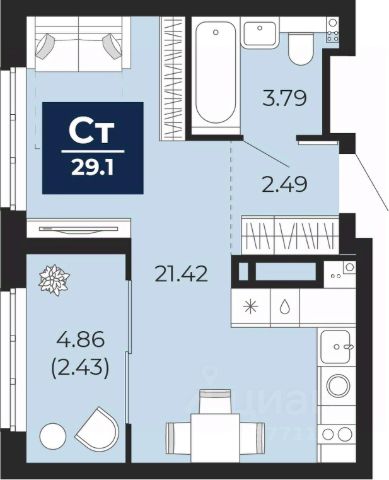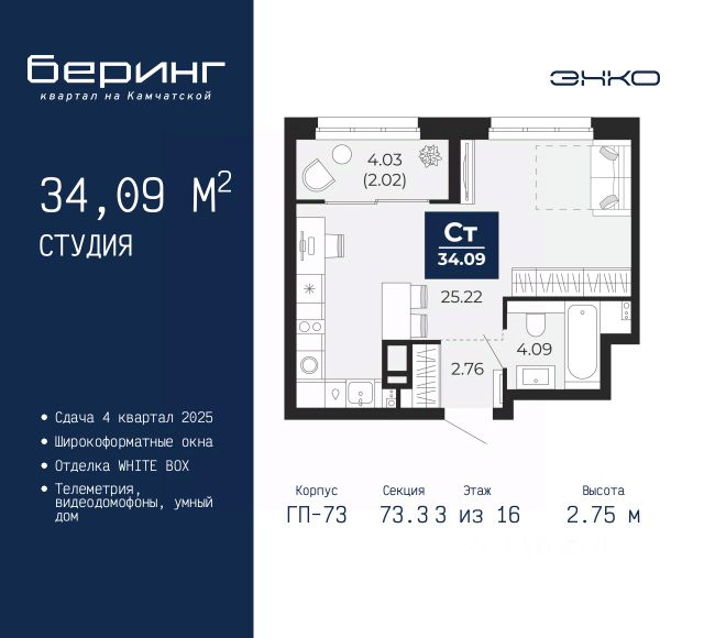 1-комн. квартира-студия от застройщика в ЖК "Беринг" на 9 этаже. Квартира без отделки, после получения ключей можно делать ремонт. Общая площадь: 32.12 кв.м., площадь гостиной 22.11 кв.м., из которых 5 кв.м. выделено под кухонную зону. Все окна выходят на одну сторону. В квартире один балкон, один совмещенный санузел. Высота потолков 2.75 м.