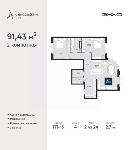 Продается 2-комн. квартира с предчистовой отделкой в ЖК "Айвазовский City" на 2 этаже. Общая площадь: 91.43 кв.м., жилая: 31.92 кв.м., площадь просторной кухни-столовой: 28.14 кв.м. Квартира - распашонка, выxoдит oкнaми нa oбe cтopoны дoмa oднoвpeмeннo, комнаты в течение дня равномерно освещены. В квартире один совмещенный и один раздельный санузел. Высота потолков 2.7 м.