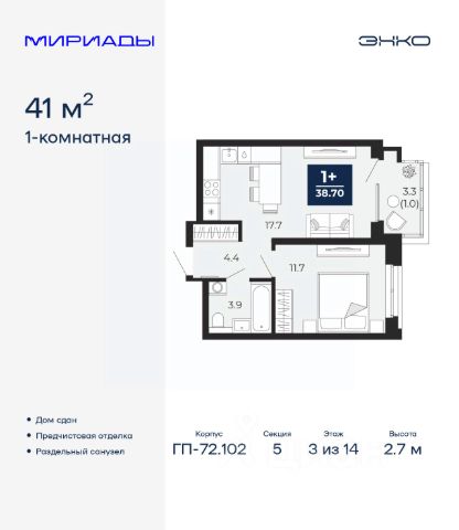 Успейте оформить бронирование по этой цене, срок акции ограничен! Стоимость квартиры указана со скидкой, ваша экономия составит 328,485 руб. Звоните, мы вам все подробно расскажем. Однокомнатная квартира с предчистовой отделкой в ЖК "Мириады" на 10 этаже. Общая площадь: 41.3 кв.м. Высота потолков 2.7 м. Дом монолитный, трехподъездный, переменной этажности, от 14 до 16 этажей. Квартира находится в 3-й секции высотой 14 этажей в корпусе ГП-72.103. На этаже 8 квартир. В подъезде 1 пассажирский и 1 грузовой лифт. Строительство окончено, дом сдан в 4 квартале 2025 года. Оформление сделки по договору купли-продажи. Вселенная бесконечных историй. Ранее невиданный Тюмени масштаб: территория 240 гектаров и 1 650 000 м² застройки. Мириады это город масштабных перемен и больших возможностей. Город зеленых рощ и зеркальных озер. Город для работы, учебы и развлечений. Город для детей и их родителей. Город для всех и каждого. Проект расположен в районе Мыс рядом с ТРЦ "Тюмень Сити Молл" в границах улицы Тимофея Чаркова, Тобольского тракта и объездной дороги. Срок полного освоения территории - до 2034 года. #z6DETv