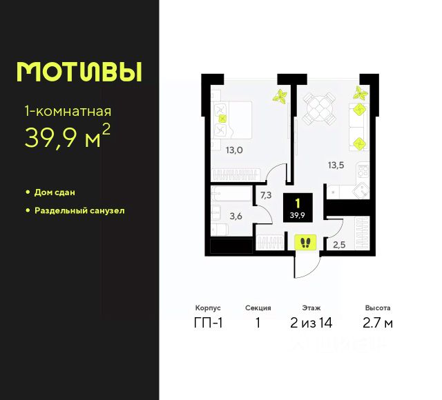 1-комн. квартира-студия от застройщика с предчистовой отделкой в ЖК "Мотивы" на 12 этаже. Общая площадь: 24.95 кв.м., площадь гостиной 14.02 кв.м., из которых 5 кв.м. выделено под кухонную зону. Все окна выходят на одну сторону. В квартире один балкон, один совмещенный санузел. Высота потолков 2.7 м.