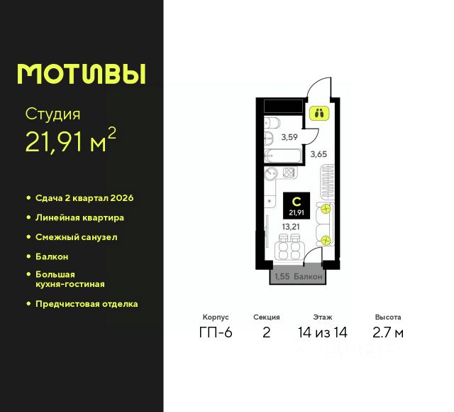 Просторная однокомнатная квартира-студия с предчистовой отделкой в ЖК "Мотивы" на 14 этаже. Общая площадь: 24.39 кв.м., площадь гостиной 14.27 кв.м., из которых 5 кв.м. выделено под кухонную зону. Все окна выходят на одну сторону. В квартире один балкон, один совмещенный санузел. Высота потолков 2.7 м. Квартира будет сдаваться с предчистовой отделкой White Box: выровнены и оштукатурены стены, проведено электричество и отопление, установлены радиаторы. Вы также можете приобрести квартиру с ремонтом от застройщика, представленным в трех цветовых решениях Scandi, Wood и Coffee и включающим ламинат, обои под покраску, двери, натяжной потолок и санузел с сантехникой. При желании вы можете заказать отделку под ключ, варианты возможных решений представлены в альбоме фотографий. Дом монолитный, многоподъездный, переменной этажности, от 5 до 14 этажей. Квартира находится в 5-й секции высотой 14 этажей в корпусе ГП-4. На этаже 5 квартир. В подъезде 1 пассажирский и 1 грузовой лифт. В настоящее время строительство завершено, дом сдан в 4 квартале 2024 года. Оформление сделки по договору купли-продажи. Закрытая от автомобилей территория, безопасный двор и камеры видеонаблюдения - гаранты вашего спокойствия. Квартал будет располагать богатой инфраструктурой: на первых этажах разместятся магазины, пекарни, кофейни, пункты выдачи, аптеки, детские центры, цветочные салоны и многое другое, что сделает жизнь поистине комфортной. Рядом находится парк общей площадью почти 5000 м², в котором располагаются локации для игр и отдыха жителей, здесь можно совершить утреннюю пробежку или прогуляться после рабочего дня. В парке есть зона воркаута с тренажерами для взрослых, игровые комплексы с горками и канатный комплекс для детей разных возрастов, качели и лавочки для отдыха, площадки для командных видов спорта и для панна-футбола. В ЖК "Мотивы" всё продумано до мелочей: светлые холлы входных групп, оформленные в едином стиле, просторные колясочные, лапомойки для питомцев. На территории комплекса находятся 2 8-ми этажных паркинга и более 1000 м/м на открытой парковке. Жилой комплекс находится в одном из экологически благоприятных районов Тюмени, недалеко от Плехановского бора. При этом до центра города можно добраться за 15 минут, а до международного аэропорта Рощино за 13 минут. Окончание строительства: ГП 1, 2, 3, 4 сдача до конца 2024 года, ГП 6, 7, 8 сдача 2 квартал 2026 года. #ZwaCgU