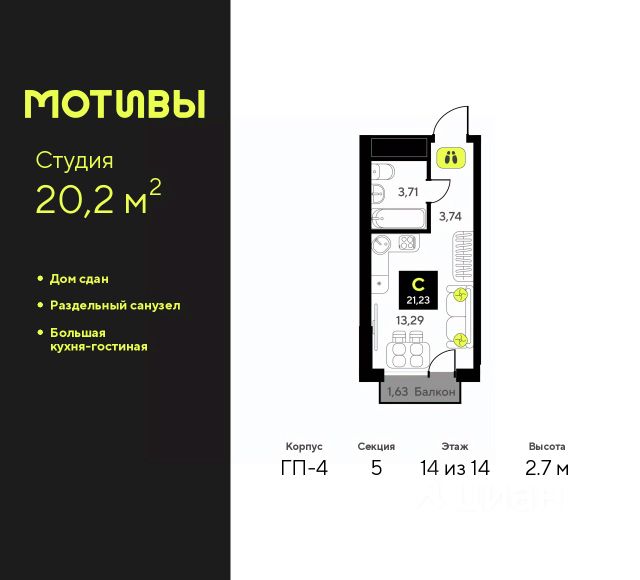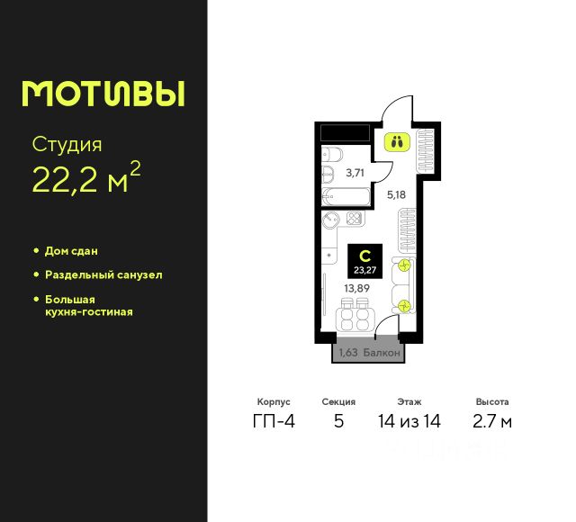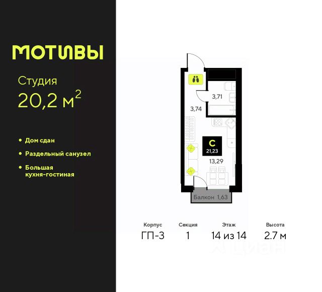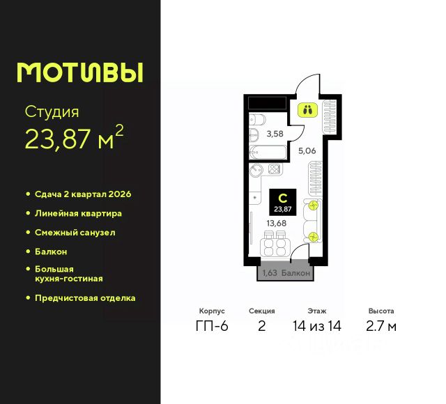 Продается однокомнатная квартира-студия от застройщика с предчистовой отделкой в ЖК "Мотивы" на 14 этаже. Общая площадь: 24.95 кв.м., площадь гостиной 14.02 кв.м., из которых 5 кв.м. выделено под кухонную зону. Все окна выходят на одну сторону. В квартире один балкон, один совмещенный санузел. Высота потолков 2.7 м. Квартира будет сдаваться с предчистовой отделкой White Box: выровнены и оштукатурены стены, проведено электричество и отопление, установлены радиаторы. Вы также можете приобрести квартиру с ремонтом от застройщика, представленным в трех цветовых решениях Scandi, Wood и Coffee и включающим ламинат, обои под покраску, двери, натяжной потолок и санузел с сантехникой. При желании вы можете заказать отделку под ключ, варианты возможных решений представлены в альбоме фотографий. Дом монолитный, черырехподъездный, переменной этажности, от 12 до 14 этажей. Квартира находится во 2-й секции высотой 14 этажей в корпусе ГП-6. На этаже 12 квартир. В подъезде 1 пассажирский и 1 грузовой лифт. Окончание строительства - 2 квартал 2026 года. Оформление сделки по договору долевого участия. Закрытая от автомобилей территория, безопасный двор и камеры видеонаблюдения - гаранты вашего спокойствия. Квартал будет располагать богатой инфраструктурой: на первых этажах разместятся магазины, пекарни, кофейни, пункты выдачи, аптеки, детские центры, цветочные салоны и многое другое, что сделает жизнь поистине комфортной. Рядом находится парк общей площадью почти 5000 м², в котором располагаются локации для игр и отдыха жителей, здесь можно совершить утреннюю пробежку или прогуляться после рабочего дня. В парке есть зона воркаута с тренажерами для взрослых, игровые комплексы с горками и канатный комплекс для детей разных возрастов, качели и лавочки для отдыха, площадки для командных видов спорта и для панна-футбола. В ЖК "Мотивы" всё продумано до мелочей: светлые холлы входных групп, оформленные в едином стиле, просторные колясочные, лапомойки для питомцев. На территории комплекса находятся 2 8-ми этажных паркинга и более 1000 м/м на открытой парковке. Жилой комплекс находится в одном из экологически благоприятных районов Тюмени, недалеко от Плехановского бора. При этом до центра города можно добраться за 15 минут, а до международного аэропорта Рощино за 13 минут. Окончание строительства: ГП 1, 2, 3, 4 сдача до конца 2024 года, ГП 6, 7, 8 сдача 2 квартал 2026 года. #2MDzOE
