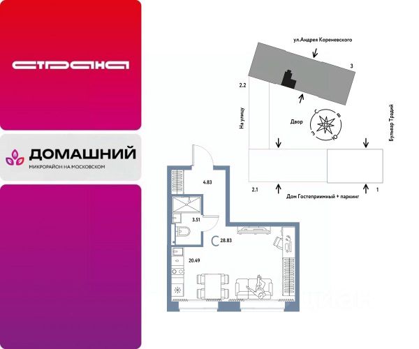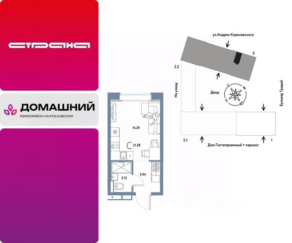 Объявление от застройщика Страна Девелопмент. Покупка квартиры защищена банком. Продается 1комнатная квартира на 13 этаже от застройщика Страна Девелопмент. Площадь квартиры 21,38 кв. м. О ПРОЕКТЕ Микрорайон "Домашний" — это 6 очередей строительства, 24 дома переменной этажности. Каждый дом уникальный. Внутри микрорайона появится огромный пешеходный бульвар — бульвар Традиций. Центром притяжения станут открытые пространства для отдыха жителей и гостей микрорайона, которые легко меняются под сезонные сценарии отдыха: новогодняя елка, ярмарки, кинопоказы и т.д. У каждого дома обустроен приватный двор с зонами для активного и спокойного отдыха. В активной зоне детские разновозрастные площадки с горками, песочницами и качелями, воркаут-зоны. В спокойной — скамейки, мини-амфитеатры, закрытые перголы. Уютной атмосферу сделает обильное озеленение и освещение "домашними" торшерами. ОТДЕЛКА Квартиры сдаются с предчистовой отделкой. Все грязные работы выполнены: произведена разводка электричества и отопления; выполнена стяжка пола; стены выровнены "под маяк". В квартире установлены розетки, выключатели и радиаторы. На входе — надежная стальная дверь. Вам остается только выбрать материалы и начать ремонт Доступна опция "Ремонт от застройщика". Стоимость можно включить в ипотеку. Вы можете заказать один из пяти стилей на выбор: шалфей, хлопковая нить, серый шторм, голубой вереск, белый камень. КУХНЯ С ТЕХНИКОЙ Теперь дополнительно к ремонту можно заказать кухню со встроенной техникой. Эргономику и функциональное наполнение разработали под каждую планировку. ПОЛНАЯ МЕБЛИРОВКА Больше не нужно тратить время даже на подбор, доставку и сборку мебели.Вы можете включить в стоимость квартиры с ремонтом полную меблировку. - Что входит в меблировку? - Кухня с техникой и сантехникой - Диван - Кровать - Шкаф в спальне - Шкаф в прихожей На консультации менеджер подскажет, какие акции действуют, и как получить одобрение по ипотеке с низкой ставкой. Более подробная информация по телефону.