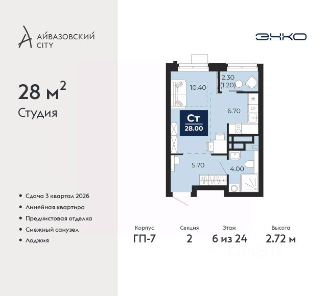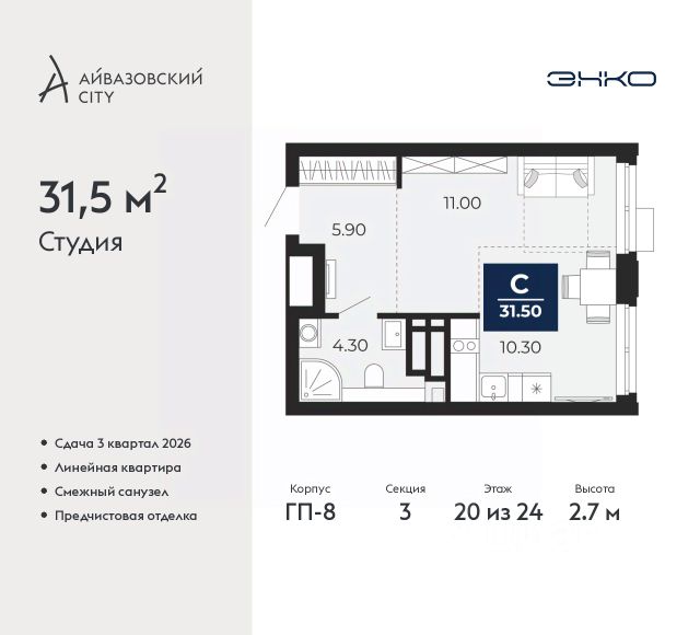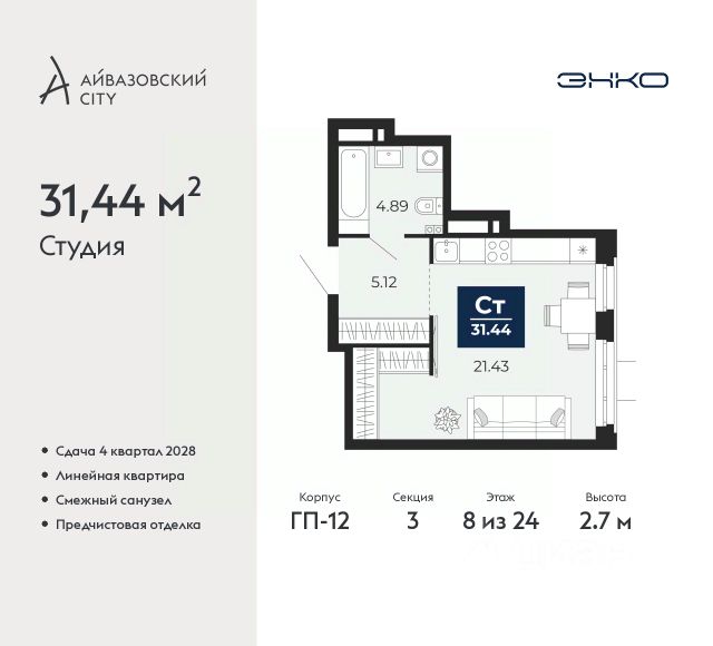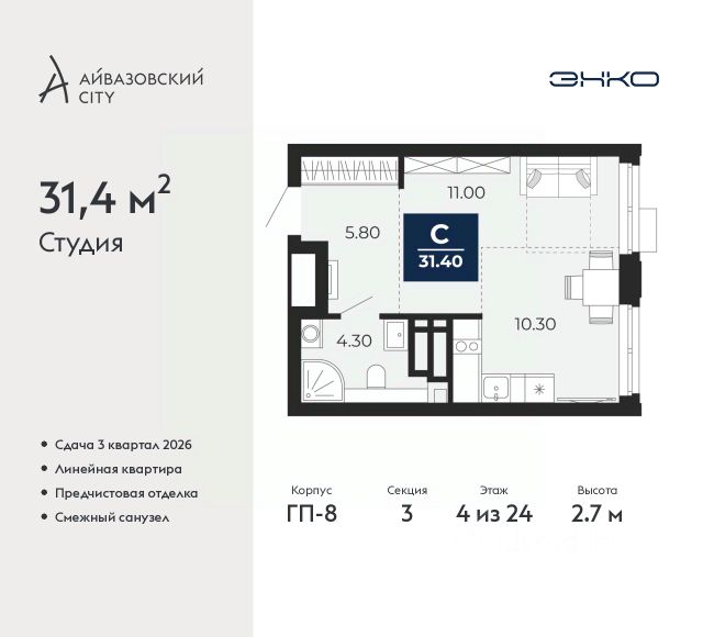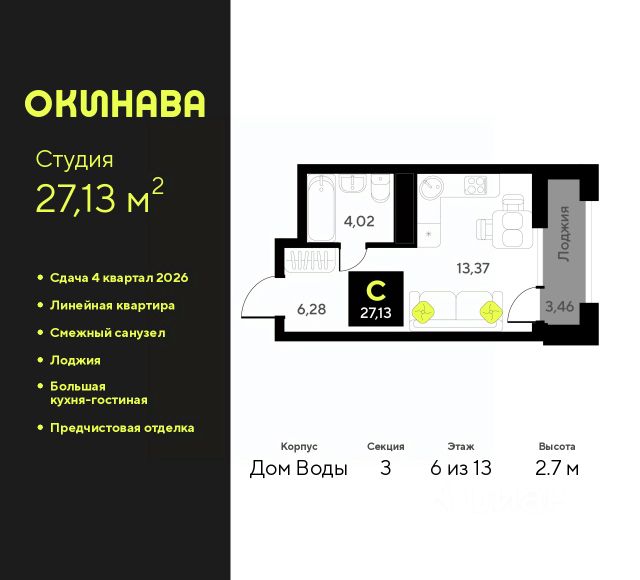 Однокомнатная квартира-студия от застройщика с предчистовой отделкой в ЖК "Окинава" на 13 этаже. Общая площадь: 29.61 кв.м., площадь гостиной 20.69 кв.м., из которых 5 кв.м. выделено под кухонную зону. Все окна выходят на одну сторону. В квартире одна лоджия, один совмещенный санузел. Высота потолков 2.7 м. Квартира будет сдана с предчистовой отделкой: на полах стяжка под финишное покрытие, стены подготовлены под покраску или оклейку обоями, разведена вся электрика с подготовкой для установки выключателей и освещения. При желании вы можете заказать отделку под ключ, варианты возможных решений представлены в альбоме фотографий. Дом монолитный, многоподъездный, переменной этажности, от 11 до 19 этажей. Квартира находится в 3-й секции высотой 13 этажей в корпусе Дом Воды. На этаже 6 квартир. В подъезде 1 пассажирский и 1 грузовой лифт. Окончание строительства - 4 квартал 2026 года. Оформление сделки по договору долевого участия. ЖК "Окинава" это не просто жилой комплекс, это остров 4 стихий. Они отражаются во внешнем виде фасадов домов, обустройстве дворов и внутреннем оформлении холлов. Каждая из стихий это отдельный дом. Между домами раскинется большой двухуровневый пешеходный бульвар. Первый уровень прогулочный с местами для отдыха, амфитеатром и фонтанами. На втором уровне расположатся площадки для детей, спортивных игр и тренировок. Квартал будет располагать богатой инфраструктурой: на первых этажах разместятся магазины, пекарни, кофейни, пункты выдачи, аптеки, детские центры, цветочные салоны и многое другое, что сделает жизнь поистине комфортной. В жилом комплексе есть кладовые, а также несколько видов паркинга: уличный гостевой, закрытый теплый и паркинг в стилобате, попасть в который можно на лифте с любого жилого этажа. Дворы в каждом доме отражают его стихию, отличаясь по наполнению. Они дополняют друг друга, образуя единое дворовое пространство жилого комплекса. Закрытая территория, свободная от автомобилей, обеспечит безопасность и спокойный отдых. Холлы оформлены керамогранитом, зеркалами и разноуровневым освещением. Витражные входные группы, мягкие зоны ожидания, видеонаблюдение 24/7, вместительные колясочные и даже лапомойки для питомцев всё это будет в ЖК "Окинава". Жилой комплекс "Окинава" находится в активно развивающемся V заречном микрорайоне, недалеко от озера Алебашево, где в будущем расположится масштабный ивент-парк с зонами отдыха. Удобная транспортная развязка позволит добраться до центра всего за 15 минут. #zWavBz