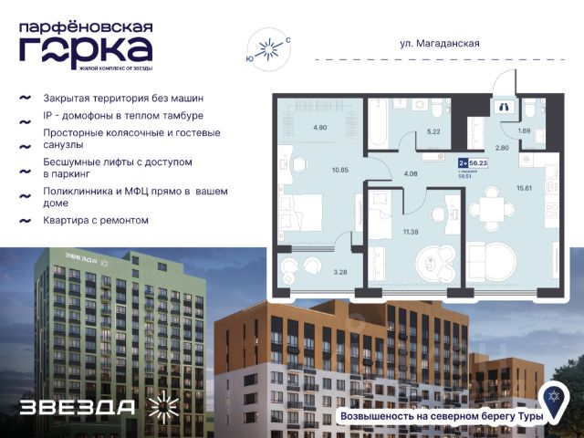 Название ЖК — не просто метафора, а часть истории Тюмени. В XVII веке на северном берегу Туры на возвышении основали деревню Парфенова. Сегодня на этом месте "Звезда" возводит современный ЖК комфорт-класса. Проект комплексного развития территории преобразит знакомый район Тюмени. В локации построят поликлинику с дневным стационаром на 100 посещений в смену и МФЦ. На первых этажах ЖК откроются супермаркеты, магазины, салоны и сервисы на каждый день — всё, что необходимо для комфортной жизни. Обслуживать дома будет сервисная компания "Звезда Управляет".