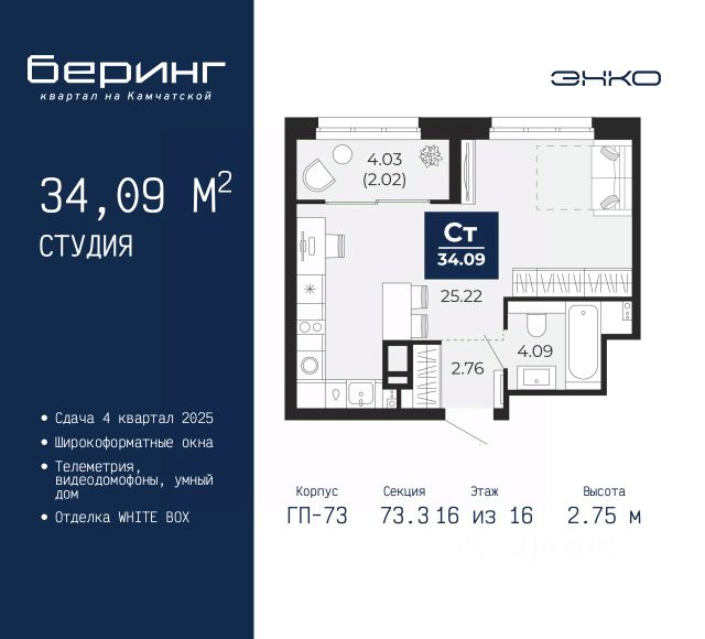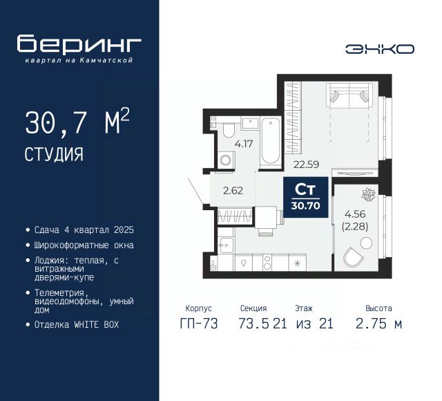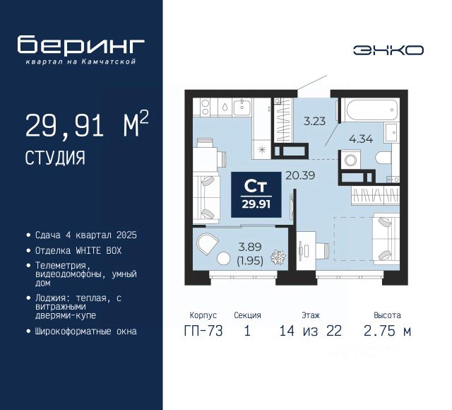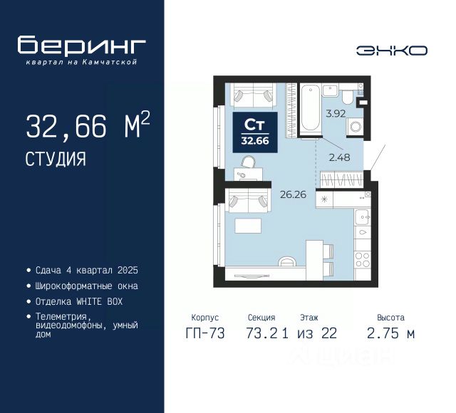 1-комн. квартира-студия от застройщика в ЖК "Беринг" на 3 этаже. Квартира без отделки, новый владелец может сделать ремонт по своему дизайн-проекту. Общая площадь: 29.02 кв.м., площадь гостиной 15.14 кв.м., из которых 5 кв.м. выделено под кухонную зону. Все окна выходят на одну сторону. В квартире один совмещенный санузел. Высота потолков 2.75 м. Дом монолитный, многоподъездный, переменной этажности, от 9 до 21 этажей. Квартира находится в 74.5-й секции высотой 21 этаж в корпусе ГП-74. На этаже 7 квартир. В подъезде 1 пассажирский и 1 грузовой лифт. Окончание строительства - 4 квартал 2025 года. Оформление сделки по договору долевого участия. Подобно знаменитому исследователю, мы чувствуем себя первооткрывателями этой локации. Хотим показать новую суть места, сформировать для вас жизненный опыт, которого ещё не было. Беринг — район зелёного цвета. Беринг — район, который откроется вам с другой стороны. Впечатлит новым уровнем комфорта и качеством жизни. Беринг — открытие на карте города. Первый квартал расположен в районе Тура, в границах улиц: Камчатская Западносибирская Энтузиастов. Вокруг уже есть всё для того, чтобы ежедневная рутина была лишь частью жизни и не доставляла дискомфорта. Школы и детские сады, магазины и аптеки, поликлиника, места для семейного отдыха, пеших и велопрогулок, и даже рыбалки. Масштабное озеленение дворов — визитная карточка ЭНКО и ваш оазис спокойствия, чтобы отвлечься от повседневности. Раскидистые деревья, кустарники, травы и цветы — осталось остановиться, вдохнуть и расслабиться, глядя на эту природную красоту. Стилистика подъездов продолжает концепцию Беринга, вдохновлённого Камчаткой: сдержанный, но при этом впечатляющий дизайн соседствует с удобством и функциональностью. #Zuswai Купить квартиру-студию в новостройке без отделки в Тюмени.