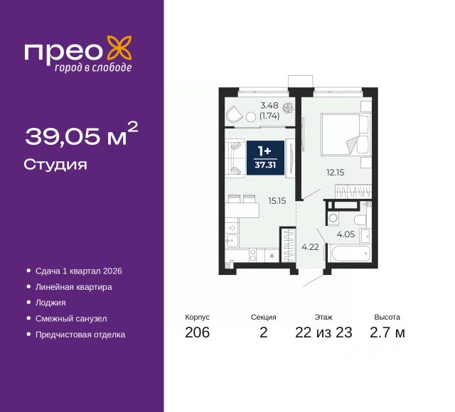 Просторная 1-комн. квартира-студия с предчистовой отделкой в ЖК "Прео" на 16 этаже. Общая площадь: 39.05 кв.м., площадь гостиной 27.11 кв.м., из которых 14.5 кв.м. выделено под кухонную зону. Все окна выходят на одну сторону. В квартире одна лоджия, один совмещенный санузел. Высота потолков 2.7 м.