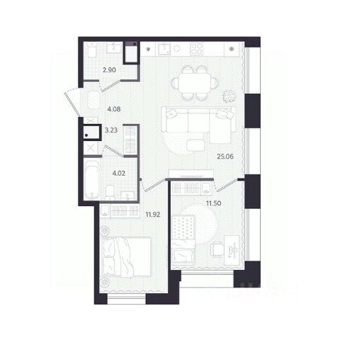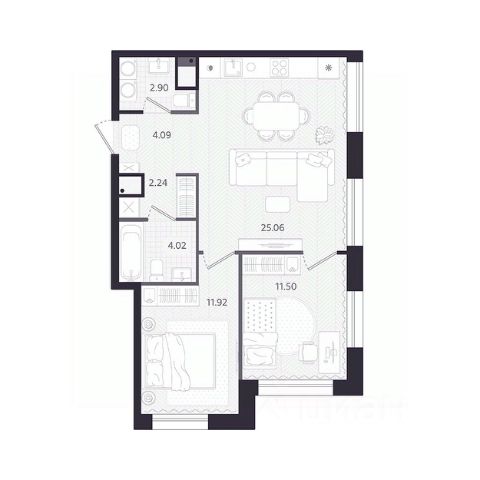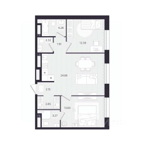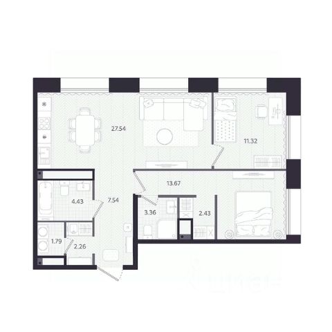 Квартира с кухней-гостиной и двумя спальнями в кварталах "На Минской". Особенности планировки: гардеробная, лоджия, мастер-спальня, панорамное остекление, предчистовая отделка.