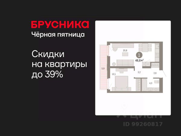Однокомнатная квартира с предчистовой отделкой в ЖК "Республики 205" на 5 этаже. Общая площадь: 48.88 кв.м., жилая: 12.1 кв.м., площадь просторной кухни-гостиной: 20.8 кв.м. Все окна выходят на одну сторону. В квартире один балкон, один совмещенный санузел. Высота потолков 2.7 м.