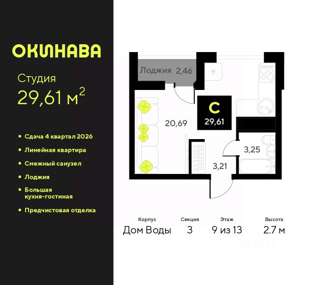 Просторная 1-комн. квартира-студия с предчистовой отделкой в ЖК "Окинава" на 9 этаже. Общая площадь: 29.61 кв.м., площадь гостиной 20.69 кв.м., из которых 5 кв.м. выделено под кухонную зону. Все окна выходят на одну сторону. В квартире одна лоджия, один совмещенный санузел. Высота потолков 2.7 м.