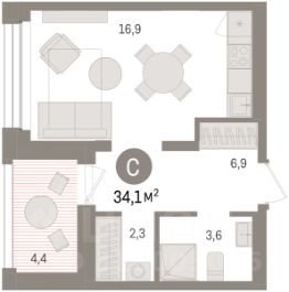 Просторная однокомнатная студия с предчистовой отделкой в ЖК "Республики 205" на 6 этаже. Общая площадь: 19.82 кв.м., площадь гостиной 10.1 кв.м., из которых 5 кв.м. выделено под кухонную зону. Все окна выходят на одну сторону. В квартире один балкон, один совмещенный санузел. Высота потолков 2.6 м.