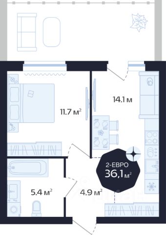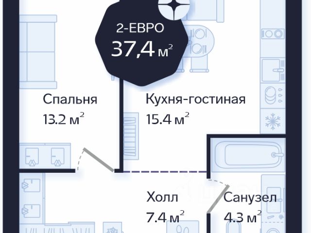 Квартира с кухней-гостиной и двумя спальнями в кварталах "На Минской". Особенности планировки: предчистовая отделка.