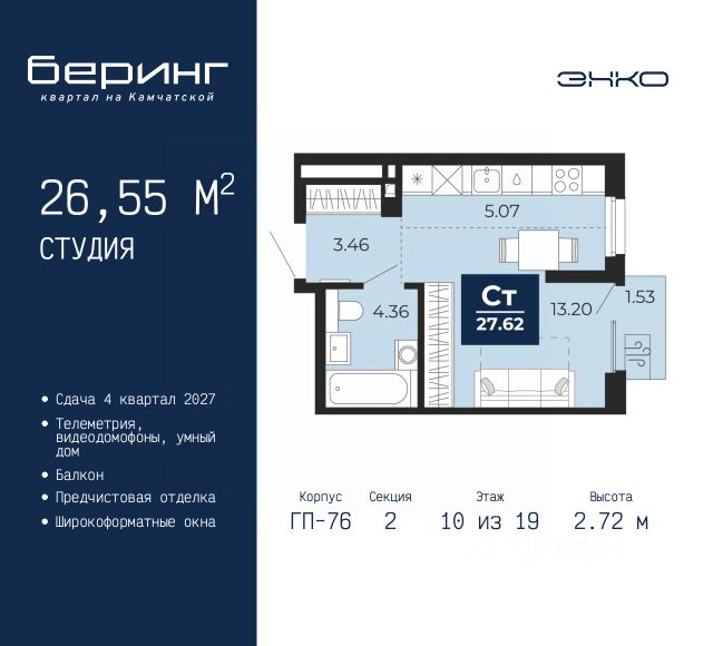 Однокомнатная квартира-студия с предчистовой отделкой в ЖК "Беринг" на 6 этаже. Общая площадь: 27.8 кв.м., площадь гостиной 16.49 кв.м., из которых 7.03 кв.м. выделено под кухонную зону. Все окна выходят на одну сторону. В квартире один балкон, один совмещенный санузел. Высота потолков 2.72 м. Дом монолитный, многоподъездный, переменной этажности, от 17 до 24 этажей. Квартира находится в 1-й секции высотой 23 этажа в корпусе ГП-75. На этаже 8 квартир. В подъезде 2 пассажирских и 1 грузовой лифт. Окончание строительства - 4 квартал 2027 года. Оформление сделки по договору долевого участия. Подобно знаменитому исследователю, мы чувствуем себя первооткрывателями этой локации. Хотим показать новую суть места, сформировать для вас жизненный опыт, которого ещё не было. Беринг — район зелёного цвета. Беринг — район, который откроется вам с другой стороны. Впечатлит новым уровнем комфорта и качеством жизни. Беринг — открытие на карте города. Первый квартал расположен в районе Тура, в границах улиц: Камчатская Западносибирская Энтузиастов. Вокруг уже есть всё для того, чтобы ежедневная рутина была лишь частью жизни и не доставляла дискомфорта. Школы и детские сады, магазины и аптеки, поликлиника, места для семейного отдыха, пеших и велопрогулок, и даже рыбалки. Масштабное озеленение дворов — визитная карточка ЭНКО и ваш оазис спокойствия, чтобы отвлечься от повседневности. Раскидистые деревья, кустарники, травы и цветы — осталось остановиться, вдохнуть и расслабиться, глядя на эту природную красоту. Стилистика подъездов продолжает концепцию Беринга, вдохновлённого Камчаткой: сдержанный, но при этом впечатляющий дизайн соседствует с удобством и функциональностью. #zM9vFd