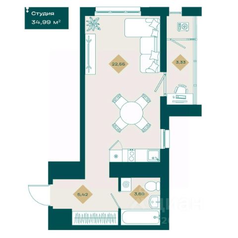 1-комн. студия от застройщика с предчистовой отделкой в ЖК "Республики 205" на 5 этаже. Общая площадь: 19.82 кв.м., площадь гостиной 10.1 кв.м., из которых 5 кв.м. выделено под кухонную зону. Все окна выходят на одну сторону. В квартире один балкон, один совмещенный санузел. Высота потолков 2.6 м.