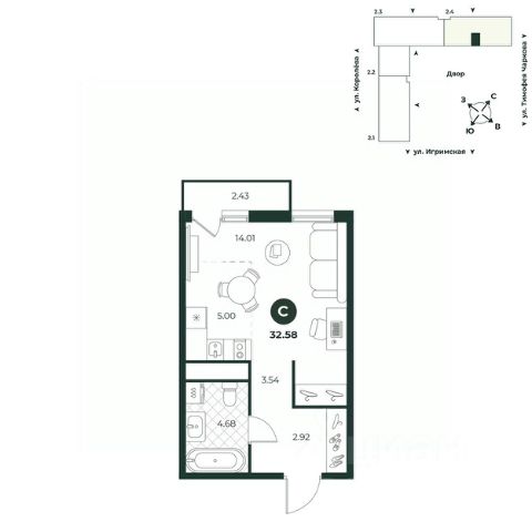 Уютная студия с французским балконом — это функциональное пространство, наполненное естественным светом, которое идеально подходит для молодых семей. Окна выходят во двор. В прихожей есть ниша под шкаф.