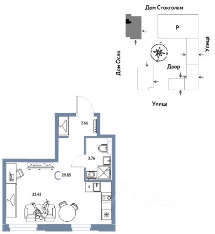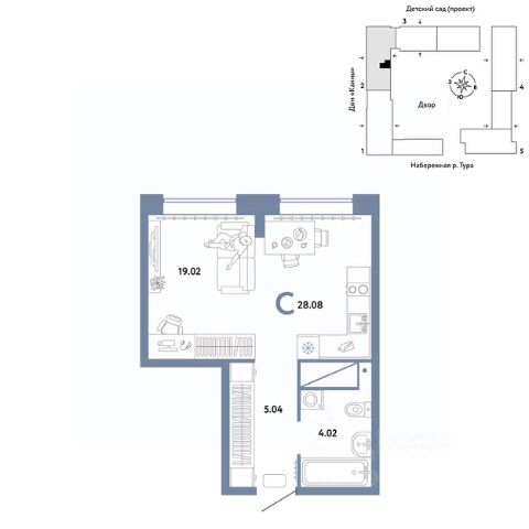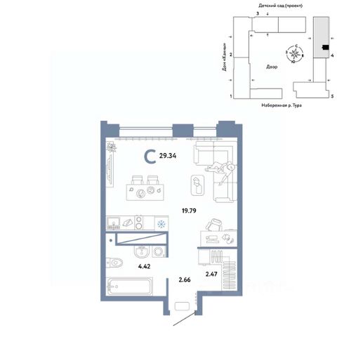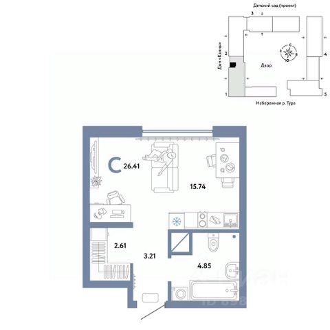 Квартира в счёт первоначального взноса по программе обмена. Информация по телефону, мы вам все подробно расскажем! Однокомнатная студия от застройщика с предчистовой отделкой в ЖК "Зарека" на 9 этаже. Общая площадь: 32.72 кв.м., площадь гостиной 19.6 кв.м., из которых 5 кв.м. выделено под кухонную зону. Все окна выходят на одну сторону. В квартире один балкон, один совмещенный санузел. Высота потолков 2.7 м. Квартира находится в корпусе 5-1. Дом монолитный, одноподъездный, высотой 25 этажей. На этаже 12 квартир. В подъезде 2 пассажирских и 1 грузовой лифт. Окончание строительства - 1 квартал 2027 года. Оформление сделки по договору долевого участия. Студия в жилом районе "Зарека". Особенности планировки: гардеробная, предчистовая отделка, балкон. квартиры в нашей базе: ЗРК05.1-Ж1.9.10. Проект На планировочную структуру "Зареки" повлияла близость к автомобильному мосту Челюскинцев. Мы расположили жилые здания так, чтобы они постепенно удалялись от проезжей части. Приём напоминает лесенку: чем сильнее мост возвышается над участком застройки, тем дальше по отношению к нему стоят дома. Этот ступенчатый сдвиг позволил нам сформировать буфер между кварталами и оживлённой магистралью. Мы намерены высадить здесь высокие деревья и создать дополнительную защиту от дорожных шума и пыли. В границах нашего участка мы намерены разместить школу и два встроенных детских сада на 135 и 150 мест. Общественные пространства С севера на юг территорию будет пронизывать пешеходный бульвар. Мы мыслим это общественное пространство как главный центр притяжения. На нём будут сосредоточены основные детские игровые и спортивные зоны, места для встреч и спокойного отдыха. Он также сыграет роль мостика, ведущего к другим нашим проектам — "Европейскому кварталу" и "Дому у озера". Одна из базовых идей мастер-плана касается береговой линии. Сегодня озеленение этой территории носит стихииныи характер, а прямому доступу к Туре препятствует дамба. Мы хотим благоустроить пространства у воды и открыть их для людей. Архитекторы спроектировали систему многоярусных троп и спусков к реке, смотровые площадки и места для активного отдыха и пикников. #ZSvOmD