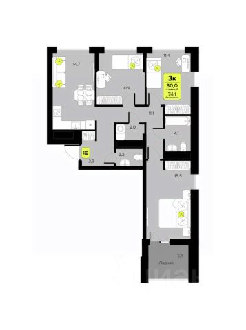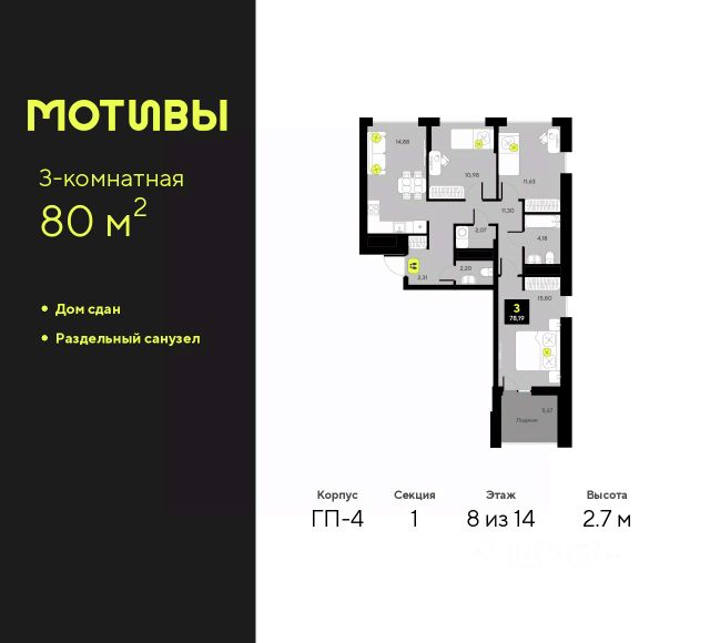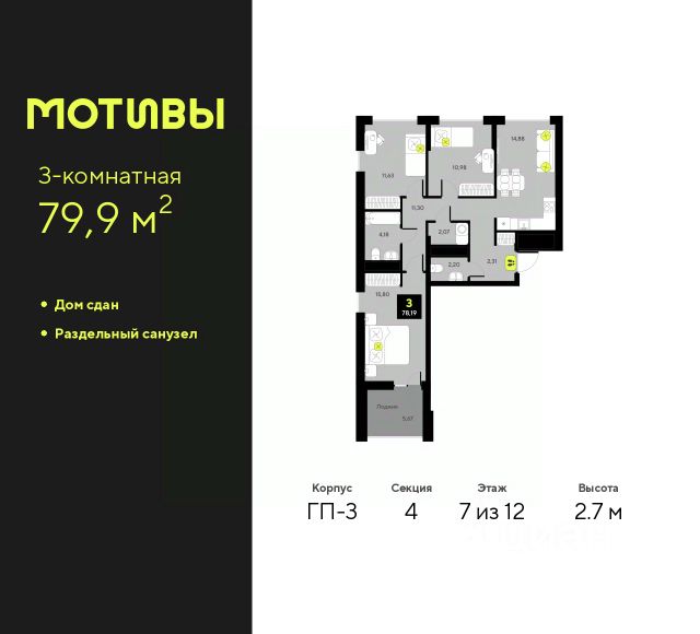 Дом монолитный, многоподъездный, переменной этажности, от 5 до 14 этажей. Квартира находится в 4-й секции высотой 14 этажей в корпусе ГП-4. На этаже 12 квартир. В подъезде 1 пассажирский и 1 грузовой лифт. В настоящее время строительство окончено, дом сдан в 4 квартале 2024 года. Оформление сделки по договору купли-продажи.
