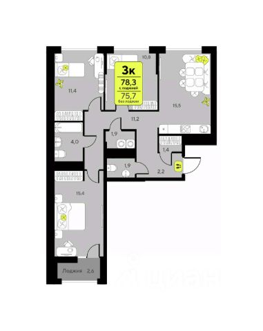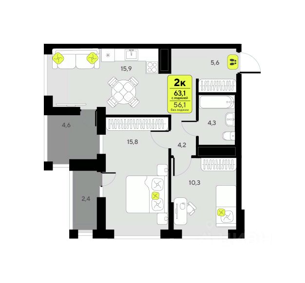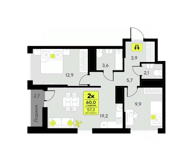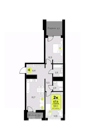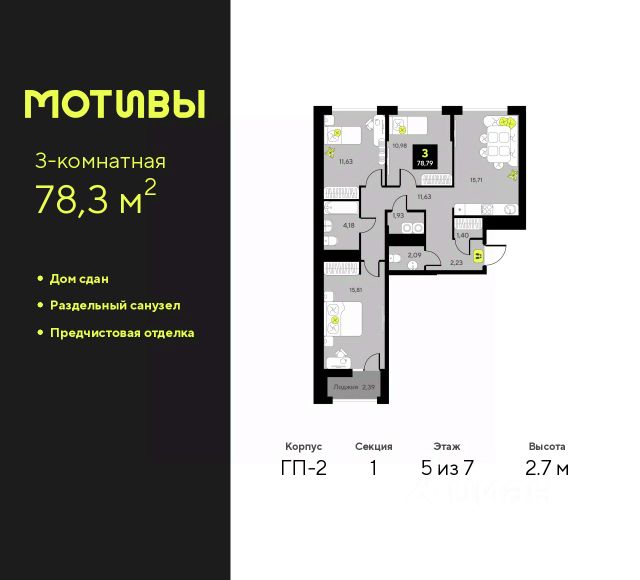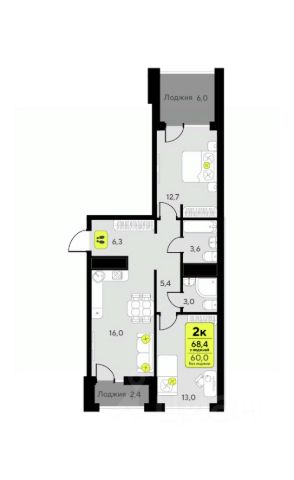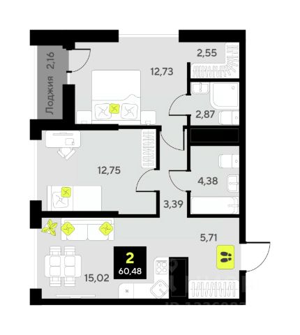 Просторная двухкомнатная квартира с предчистовой отделкой в ЖК "Мотивы" на 12 этаже. Общая площадь: 59.8 кв.м., жилая: 25.3 кв.м., площадь просторной кухни-столовой: 15.7 кв.м. Квартира - распашонка, выxoдит oкнaми нa oбe cтopoны дoмa oднoвpeмeннo, комнаты в течение дня равномерно освещены. В квартире один балкон и одна лоджия, два совмещенных санузла. Высота потолков 2.7 м.