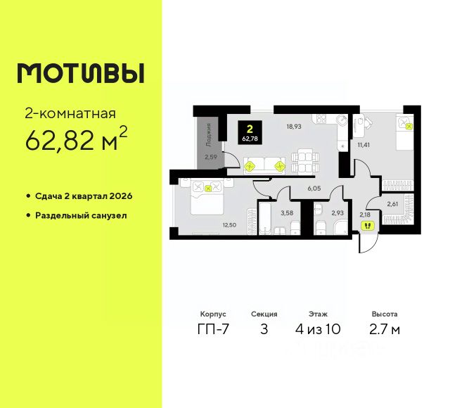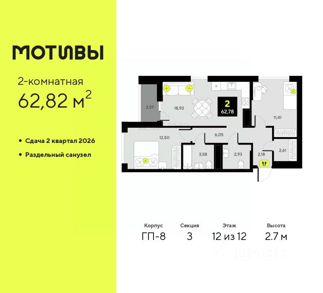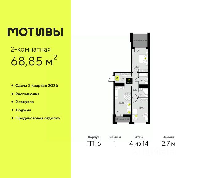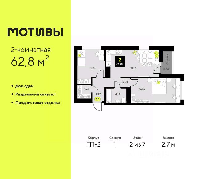 Двухкомнатная квартира с предчистовой отделкой в ЖК "Мотивы" на 2 этаже. Общая площадь: 62.8 кв.м. Высота потолков 2.7 м.