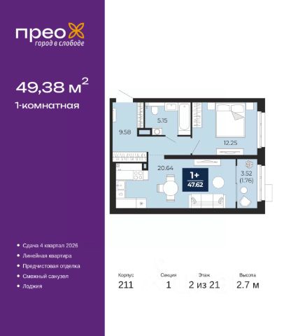 Просторная однокомнатная квартира с предчистовой отделкой в ЖК "Прео" на 12 этаже. Общая площадь: 48.5 кв.м., жилая: 12.25 кв.м., площадь просторной кухни-столовой: 20.2 кв.м. Все окна выходят на одну сторону. В квартире одна лоджия, один совмещенный санузел. Высота потолков 2.7 м.