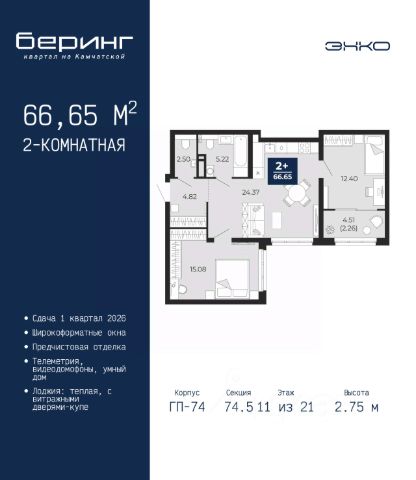 Продается 2-комн. квартира от застройщика с предчистовой отделкой в ЖК "Беринг" на 11 этаже. Общая площадь: 66.65 кв.м., жилая: 27.48 кв.м., площадь просторной кухни-столовой: 24.37 кв.м. Квартира угловая, идеально подойдет любителям тишины и панорамных видов. В квартире одна лоджия, один совмещенный и один раздельный санузел. Высота потолков 2.75 м.