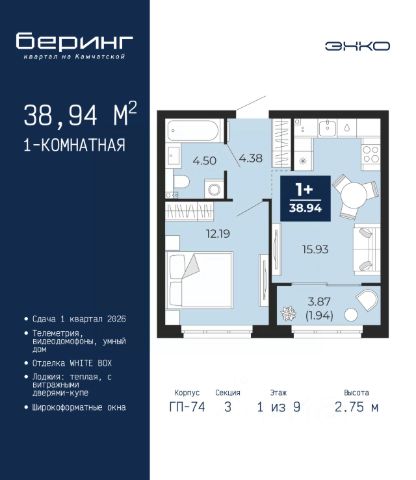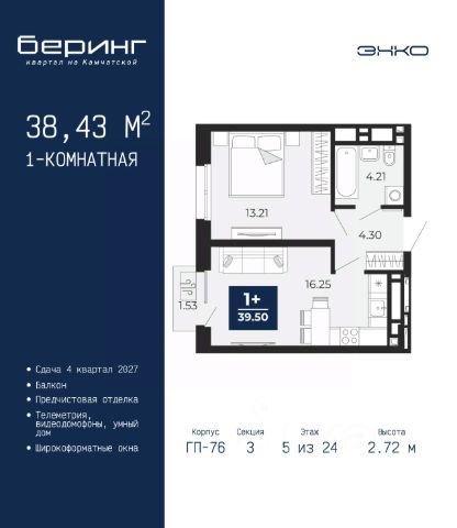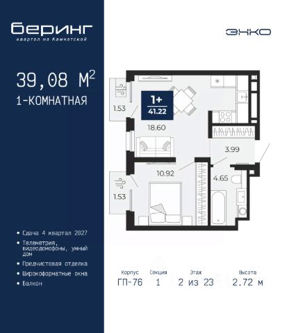 1-комн. квартира-студия с предчистовой отделкой в ЖК "Беринг" на 22 этаже. Общая площадь: 29.1 кв.м., площадь гостиной 21.42 кв.м., из которых 5 кв.м. выделено под кухонную зону. Все окна выходят на одну сторону. В квартире одна лоджия, один совмещенный санузел. Высота потолков 2.75 м.
