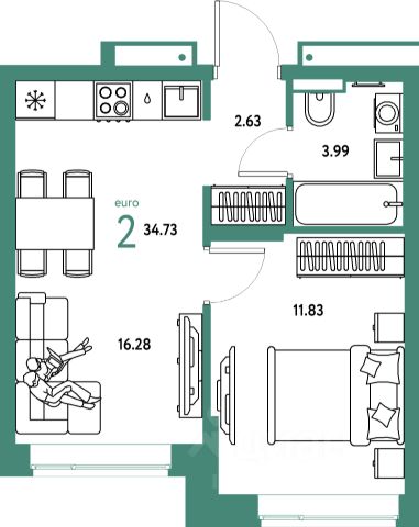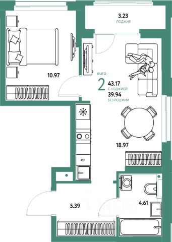 Квартира с кухней-гостиной и одной спальней в жилом районе "Речной порт". Особенности планировки: балкон, вид на реку, предчистовая отделка.
