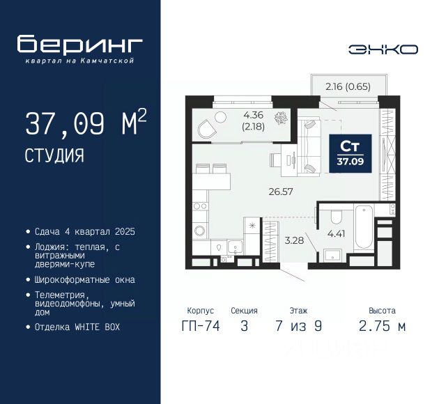 1-комн. квартира-студия от застройщика с предчистовой отделкой в ЖК "Беринг" на 10 этаже. Общая площадь: 26.55 кв.м., площадь гостиной 18.27 кв.м., из которых 5.07 кв.м. выделено под кухонную зону. Все окна выходят на одну сторону. В квартире один балкон, один совмещенный санузел. Высота потолков 2.72 м. Дом монолитный, черырехподъездный, переменной этажности, от 19 до 24 этажей. Квартира находится во 2-й секции высотой 19 этажей в корпусе ГП-76. На этаже 8 квартир. В подъезде 1 пассажирский и 1 грузовой лифт. Окончание строительства - 4 квартал 2027 года. Оформление сделки по договору долевого участия. Подобно знаменитому исследователю, мы чувствуем себя первооткрывателями этой локации. Хотим показать новую суть места, сформировать для вас жизненный опыт, которого ещё не было. Беринг — район зелёного цвета. Беринг — район, который откроется вам с другой стороны. Впечатлит новым уровнем комфорта и качеством жизни. Беринг — открытие на карте города. Первый квартал расположен в районе Тура, в границах улиц: Камчатская Западносибирская Энтузиастов. Вокруг уже есть всё для того, чтобы ежедневная рутина была лишь частью жизни и не доставляла дискомфорта. Школы и детские сады, магазины и аптеки, поликлиника, места для семейного отдыха, пеших и велопрогулок, и даже рыбалки. Масштабное озеленение дворов — визитная карточка ЭНКО и ваш оазис спокойствия, чтобы отвлечься от повседневности. Раскидистые деревья, кустарники, травы и цветы — осталось остановиться, вдохнуть и расслабиться, глядя на эту природную красоту. Стилистика подъездов продолжает концепцию Беринга, вдохновлённого Камчаткой: сдержанный, но при этом впечатляющий дизайн соседствует с удобством и функциональностью. #ZmMcm0 Продается квартира-студия с балконом в Тюмени.