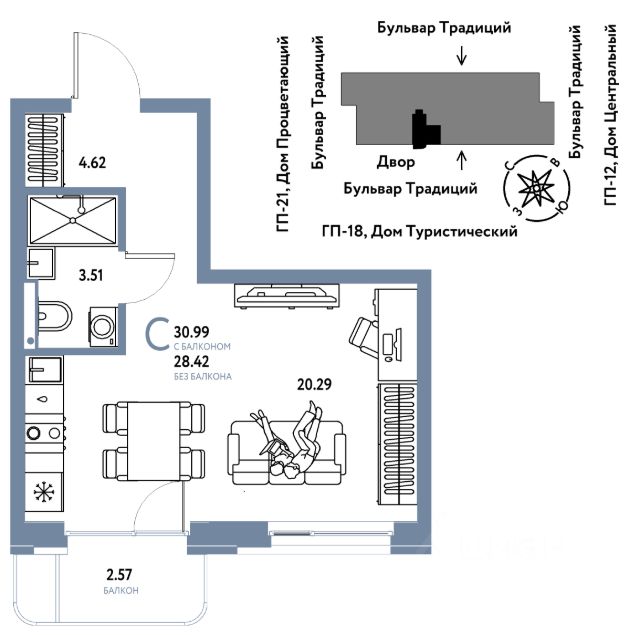 Студия в Октябрьском на Туре. Особенности планировки: предчистовая отделка, тёплая лоджия. квартиры в нашей базе: КО-07.1-2-2.16.3. Район Проект расположен на берегу реки, в одном из самых живописных и экологичных районов Тюмени. За последние годы облик района изменился. По соседству с индивидуальной застройкой выросли многоквартирные дома. При проектировании "Октябрьского на Туре" нашей приоритетной задачей стало сохранение природного ландшафта: мы постарались деликатно вписать в него современную архитектуру. Квартал удачно расположен с точки зрения дорожной инфраструктуры. На автомобиле путь до центра города составит 15 минут. Добраться до набережной и главных тюменских достопримечательностей можно и на общественном транспорте. В пешей доступности находится автобусная остановка. Проект По мастер-плану здесь будет восемь домов. Ядро застройки составляют замкнутые кварталы переменной этажности. Их высотность понижается по мере приближения к реке. На углах участка мы разместили башни-доминанты. Одной из достопримечательностей квартала станет парк на Туре — здесь появится зеленая зона протяженностью около 6 километров для пеших и велопрогулок. Смысловая ось квартала — широкая главная улица с высаженными вдоль неё высокими деревьями. Они создают тень и работают как шумо- и пылезащитные экраны. Это место сосредоточения основных пешеходных и транспортных потоков, на сторону которых мы ориентировали большинство коммерческих помещений. Отсюда жители могут свернуть на тихие соседские улицы и попасть на внутриквартальную площадь — ещё одну точку притяжения. #ZiwA8d