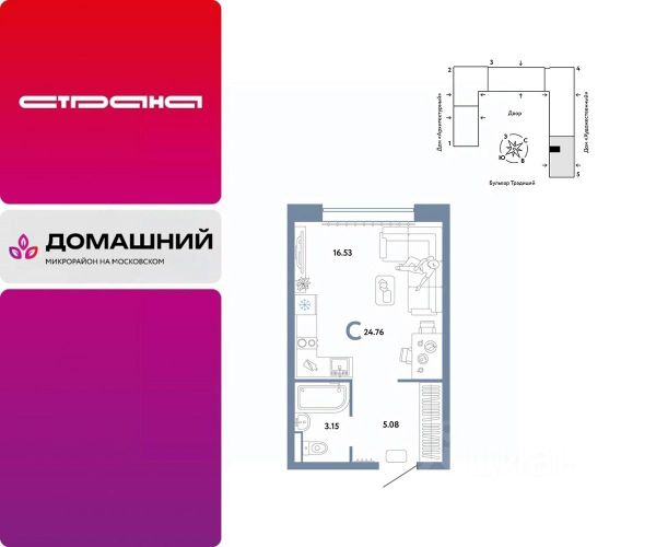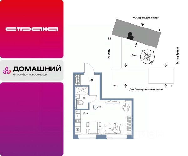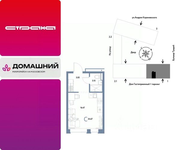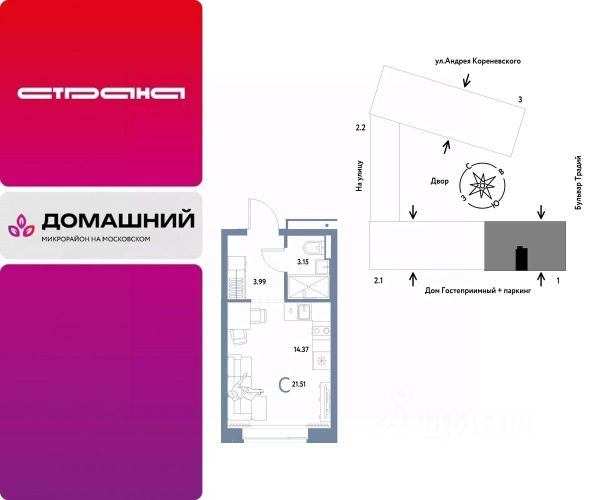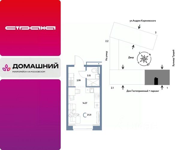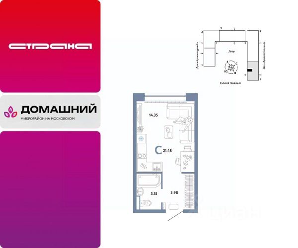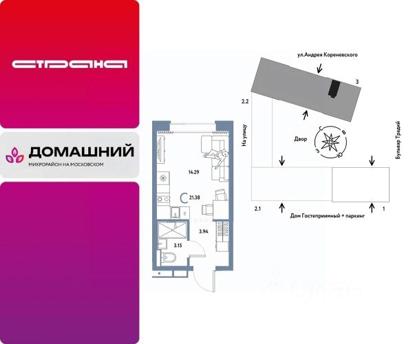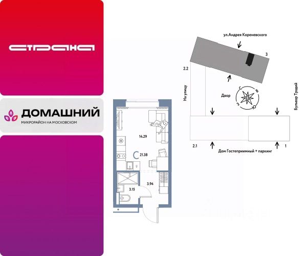 Объявление от застройщика Страна Девелопмент. Покупка квартиры защищена банком. Продается 1комнатная квартира на 4 этаже от застройщика Страна Девелопмент. Площадь квартиры 21,38 кв. м. О ПРОЕКТЕ Микрорайон "Домашний" — это 6 очередей строительства, 24 дома переменной этажности. Каждый дом уникальный. Внутри микрорайона появится огромный пешеходный бульвар — бульвар Традиций. Центром притяжения станут открытые пространства для отдыха жителей и гостей микрорайона, которые легко меняются под сезонные сценарии отдыха: новогодняя елка, ярмарки, кинопоказы и т.д. У каждого дома обустроен приватный двор с зонами для активного и спокойного отдыха. В активной зоне детские разновозрастные площадки с горками, песочницами и качелями, воркаут-зоны. В спокойной — скамейки, мини-амфитеатры, закрытые перголы. Уютной атмосферу сделает обильное озеленение и освещение "домашними" торшерами. ОТДЕЛКА Квартиры сдаются с предчистовой отделкой. Все грязные работы выполнены: произведена разводка электричества и отопления; выполнена стяжка пола; стены выровнены "под маяк". В квартире установлены розетки, выключатели и радиаторы. На входе — надежная стальная дверь. Вам остается только выбрать материалы и начать ремонт Доступна опция "Ремонт от застройщика". Стоимость можно включить в ипотеку. Вы можете заказать один из пяти стилей на выбор: шалфей, хлопковая нить, серый шторм, голубой вереск, белый камень. КУХНЯ С ТЕХНИКОЙ Теперь дополнительно к ремонту можно заказать кухню со встроенной техникой. Эргономику и функциональное наполнение разработали под каждую планировку. ПОЛНАЯ МЕБЛИРОВКА Больше не нужно тратить время даже на подбор, доставку и сборку мебели.Вы можете включить в стоимость квартиры с ремонтом полную меблировку. - Что входит в меблировку? - Кухня с техникой и сантехникой - Диван - Кровать - Шкаф в спальне - Шкаф в прихожей На консультации менеджер подскажет, какие акции действуют, и как получить одобрение по ипотеке с низкой ставкой. Более подробная информация по телефону.