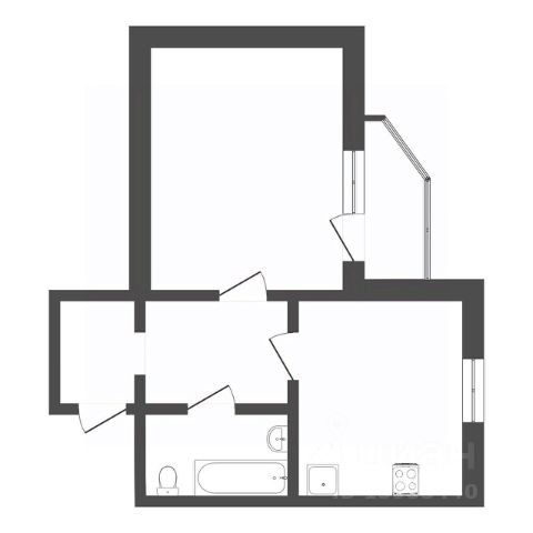 Владелец квартиры разделил комнату пополам перегородкой, в результате чего получилась малогабаритная двушка со спальней (вход из коридора) и залом (вход из кухни).