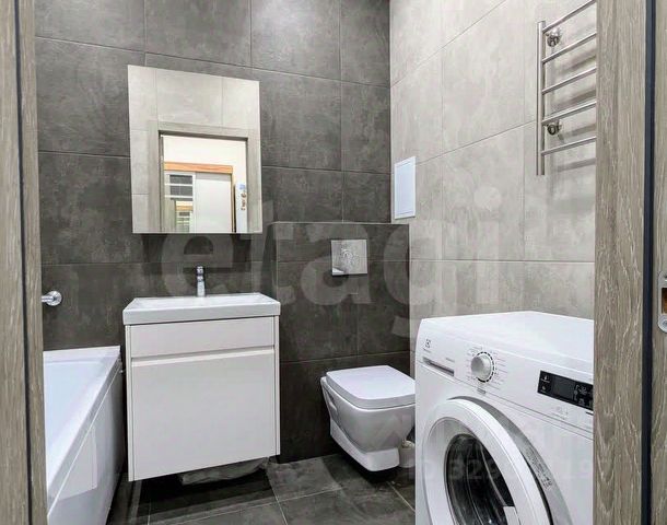 Квартира полностью укомплектована: остаётся всё, что видите на фото — кондиционер, холодильник, стиральная машинка, кухонный гарнитур с плитой, диван, прихожая.