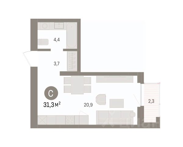 1-комн. студия от застройщика с предчистовой отделкой в ЖК "Республики 205" на 9 этаже. Общая площадь: 27.19 кв.м., площадь гостиной 13.8 кв.м., из которых 5 кв.м. выделено под кухонную зону. Все окна выходят на одну сторону. В квартире один балкон, один совмещенный санузел. Наличие террасы в квартире дает возможность для создания зон отдыха в кругу семьи и друзей. Высота потолков 2.7 м.