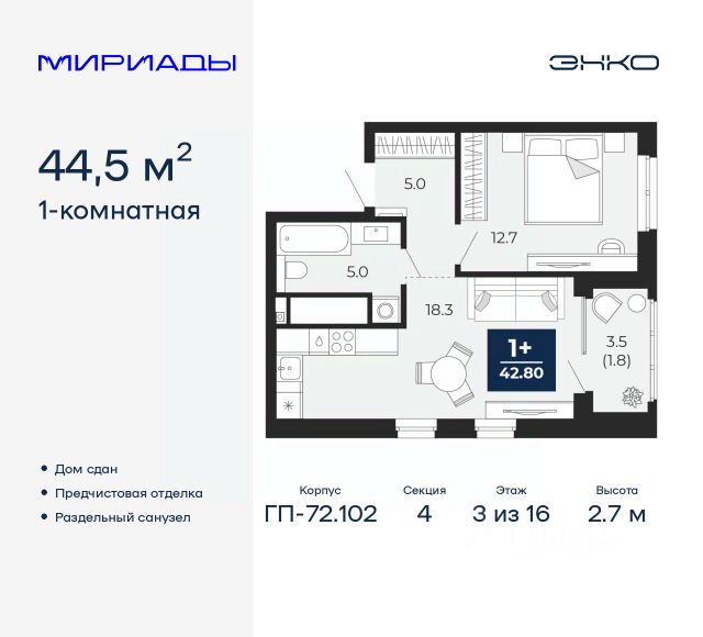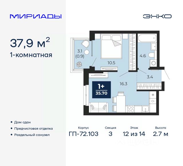 1-комн. квартира-студия с предчистовой отделкой в ЖК "Мириады" на 16 этаже. Общая площадь: 35.1 кв.м., площадь гостиной 21.9 кв.м., из которых 11.7 кв.м. выделено под кухонную зону. Угловая квартира, идеально подойдет любителям тишины и панорамных видов. В квартире один балкон, один совмещенный санузел. Высота потолков 2.7 м. Дом монолитный, двухподъездный, переменной этажности, от 14 до 18 этажей. Квартира находится в 1-й секции высотой 18 этажей в корпусе ГП-72.104. На этаже 6 квартир. В подъезде 1 пассажирский и 1 грузовой лифт. На сегодняшний день строительство окончено, дом сдан в 4 квартале 2025 года. Оформление сделки по договору купли-продажи. Вселенная бесконечных историй. Ранее невиданный Тюмени масштаб: территория 240 гектаров и 1 650 000 м² застройки. Мириады это город масштабных перемен и больших возможностей. Город зеленых рощ и зеркальных озер. Город для работы, учебы и развлечений. Город для детей и их родителей. Город для всех и каждого. Проект расположен в районе Мыс рядом с ТРЦ "Тюмень Сити Молл" в границах улицы Тимофея Чаркова, Тобольского тракта и объездной дороги. Срок полного освоения территории - до 2034 года. #ztO2zD