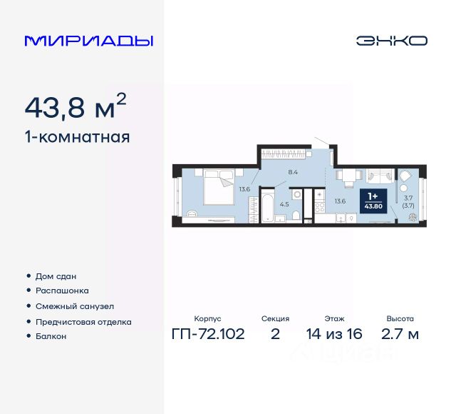 Продается 1-комн. квартира с предчистовой отделкой в ЖК "Мириады" на 14 этаже. Общая площадь: 43.8 кв.м., жилая: 13.6 кв.м., площадь просторной кухни-столовой: 13.6 кв.м. Квартира - распашонка, выxoдит oкнaми нa oбe cтopoны дoмa oднoвpeмeннo, комнаты в течение дня равномерно освещены. В квартире один балкон, один совмещенный санузел. Высота потолков 2.7 м. Дом монолитный, многоподъездный, переменной этажности, от 14 до 16 этажей. Квартира находится во 2-й секции высотой 16 этажей в корпусе ГП-72.102. На этаже 6 квартир. В подъезде 1 пассажирский и 1 грузовой лифт. Строительство завершено, дом сдан в 4 квартале 2025 года. Оформление сделки по договору купли-продажи. Вселенная бесконечных историй. Ранее невиданный Тюмени масштаб: территория 240 гектаров и 1 650 000 м² застройки. Мириады это город масштабных перемен и больших возможностей. Город зеленых рощ и зеркальных озер. Город для работы, учебы и развлечений. Город для детей и их родителей. Город для всех и каждого. Проект расположен в районе Мыс рядом с ТРЦ "Тюмень Сити Молл" в границах улицы Тимофея Чаркова, Тобольского тракта и объездной дороги. Срок полного освоения территории - до 2034 года. #2T0dMF