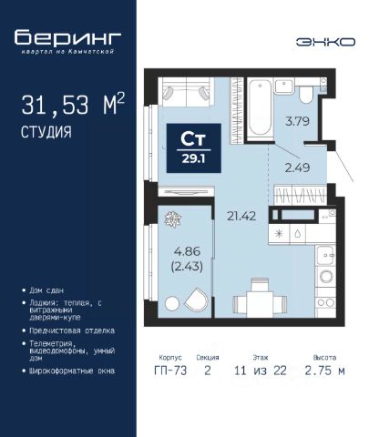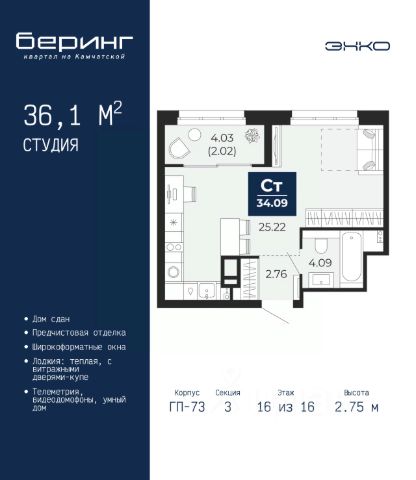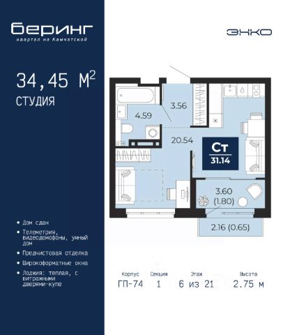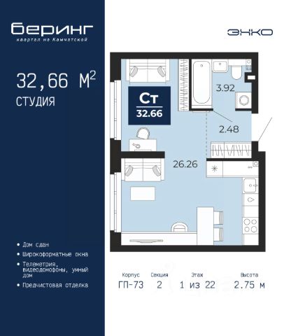 Продается 1-комн. квартира-студия с предчистовой отделкой в ЖК "Беринг" на 17 этаже. Общая площадь: 27.62 кв.м., площадь гостиной 18.9 кв.м., из которых 5.7 кв.м. выделено под кухонную зону. Все окна выходят на одну сторону. В квартире один балкон, один совмещенный санузел. Высота потолков 2.72 м. Дом монолитный, черырехподъездный, переменной этажности, от 19 до 24 этажей. Квартира находится во 2-й секции высотой 19 этажей в корпусе ГП-76. На этаже 8 квартир. В подъезде 1 пассажирский и 1 грузовой лифт. Окончание строительства - 4 квартал 2027 года. Оформление сделки по договору долевого участия. Подобно знаменитому исследователю, мы чувствуем себя первооткрывателями этой локации. Хотим показать новую суть места, сформировать для вас жизненный опыт, которого ещё не было. Беринг — район зелёного цвета. Беринг — район, который откроется вам с другой стороны. Впечатлит новым уровнем комфорта и качеством жизни. Беринг — открытие на карте города. Первый квартал расположен в районе Тура, в границах улиц: Камчатская Западносибирская Энтузиастов. Вокруг уже есть всё для того, чтобы ежедневная рутина была лишь частью жизни и не доставляла дискомфорта. Школы и детские сады, магазины и аптеки, поликлиника, места для семейного отдыха, пеших и велопрогулок, и даже рыбалки. Масштабное озеленение дворов — визитная карточка ЭНКО и ваш оазис спокойствия, чтобы отвлечься от повседневности. Раскидистые деревья, кустарники, травы и цветы — осталось остановиться, вдохнуть и расслабиться, глядя на эту природную красоту. Стилистика подъездов продолжает концепцию Беринга, вдохновлённого Камчаткой: сдержанный, но при этом впечатляющий дизайн соседствует с удобством и функциональностью. #z6DduO Продается квартира-студия в микрорайоне Энтузиастов в городе Тюмень.