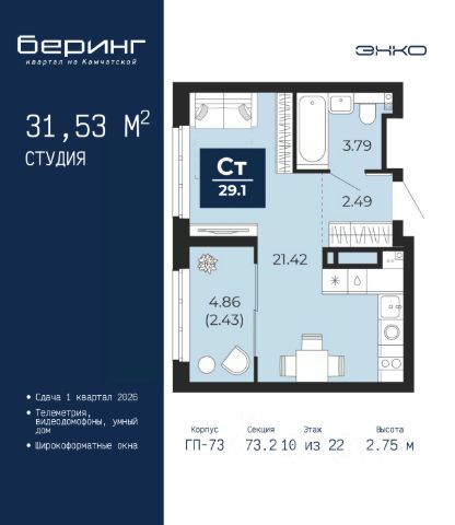 Продается однокомнатная квартира-студия с предчистовой отделкой в ЖК "Беринг" на 2 этаже. Общая площадь: 34.88 кв.м., площадь гостиной 22.5 кв.м., из которых 5.79 кв.м. выделено под кухонную зону. Все окна выходят на одну сторону. В квартире одна лоджия, один совмещенный санузел. Высота потолков 2.72 м. Дом монолитный, черырехподъездный, переменной этажности, от 19 до 24 этажей. Квартира находится в 1-й секции высотой 23 этажа в корпусе ГП-76. На этаже 7 квартир. В подъезде 2 пассажирских и 1 грузовой лифт. Окончание строительства - 4 квартал 2027 года. Оформление сделки по договору долевого участия. Подобно знаменитому исследователю, мы чувствуем себя первооткрывателями этой локации. Хотим показать новую суть места, сформировать для вас жизненный опыт, которого ещё не было. Беринг — район зелёного цвета. Беринг — район, который откроется вам с другой стороны. Впечатлит новым уровнем комфорта и качеством жизни. Беринг — открытие на карте города. Первый квартал расположен в районе Тура, в границах улиц: Камчатская Западносибирская Энтузиастов. Вокруг уже есть всё для того, чтобы ежедневная рутина была лишь частью жизни и не доставляла дискомфорта. Школы и детские сады, магазины и аптеки, поликлиника, места для семейного отдыха, пеших и велопрогулок, и даже рыбалки. Масштабное озеленение дворов — визитная карточка ЭНКО и ваш оазис спокойствия, чтобы отвлечься от повседневности. Раскидистые деревья, кустарники, травы и цветы — осталось остановиться, вдохнуть и расслабиться, глядя на эту природную красоту. Стилистика подъездов продолжает концепцию Беринга, вдохновлённого Камчаткой: сдержанный, но при этом впечатляющий дизайн соседствует с удобством и функциональностью. #Z6mbB9 Продается квартира-студия в микрорайоне Энтузиастов в городе Тюмень.