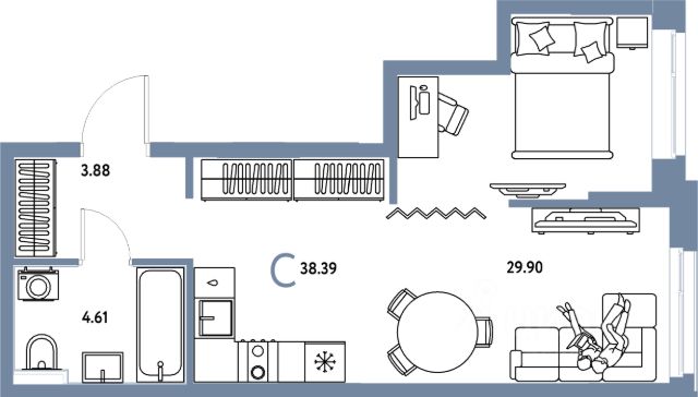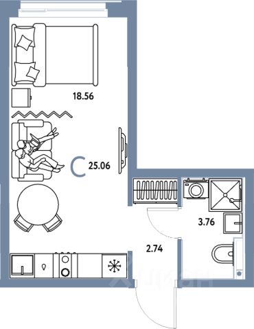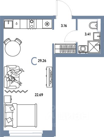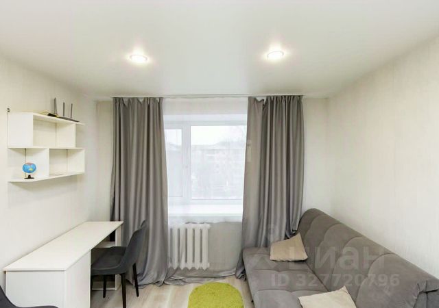 Большая комната имеет 2 окна, что позволяет при необходимости зонировать пространство на обеденную зону и зону отдыха.