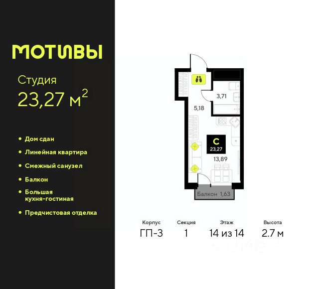 Продается 1-комн. квартира-студия от застройщика с предчистовой отделкой в ЖК "Мотивы" на 3 этаже. Общая площадь: 21.91 кв.м., площадь гостиной 13.21 кв.м., из которых 5 кв.м. выделено под кухонную зону. Все окна выходят на одну сторону. В квартире один балкон, один совмещенный санузел. Высота потолков 2.7 м. Квартира будет сдаваться с предчистовой отделкой White Box: выровнены и оштукатурены стены, проведено электричество и отопление, установлены радиаторы. Вы также можете приобрести квартиру с ремонтом от застройщика, представленным в трех цветовых решениях Scandi, Wood и Coffee и включающим ламинат, обои под покраску, двери, натяжной потолок и санузел с сантехникой. При желании вы можете заказать отделку под ключ, варианты возможных решений представлены в альбоме фотографий. Дом монолитный, черырехподъездный, переменной этажности, от 12 до 14 этажей. Квартира находится в 1-й секции высотой 14 этажей в корпусе ГП-6. На этаже 12 квартир. В подъезде 1 пассажирский и 1 грузовой лифт. Окончание строительства - 2 квартал 2026 года. Оформление сделки по договору долевого участия. Закрытая от автомобилей территория, безопасный двор и камеры видеонаблюдения - гаранты вашего спокойствия. Квартал будет располагать богатой инфраструктурой: на первых этажах разместятся магазины, пекарни, кофейни, пункты выдачи, аптеки, детские центры, цветочные салоны и многое другое, что сделает жизнь поистине комфортной. Рядом находится парк общей площадью почти 5000 м², в котором располагаются локации для игр и отдыха жителей, здесь можно совершить утреннюю пробежку или прогуляться после рабочего дня. В парке есть зона воркаута с тренажерами для взрослых, игровые комплексы с горками и канатный комплекс для детей разных возрастов, качели и лавочки для отдыха, площадки для командных видов спорта и для панна-футбола. В ЖК "Мотивы" всё продумано до мелочей: светлые холлы входных групп, оформленные в едином стиле, просторные колясочные, лапомойки для питомцев. На территории комплекса находятся 2 8-ми этажных паркинга и более 1000 м/м на открытой парковке. Жилой комплекс находится в одном из экологически благоприятных районов Тюмени, недалеко от Плехановского бора. При этом до центра города можно добраться за 15 минут, а до международного аэропорта Рощино за 13 минут. Окончание строительства: ГП 1, 2, 3, 4 сдача до конца 2024 года, ГП 6, 7, 8 сдача 2 квартал 2026 года. #2wbmet