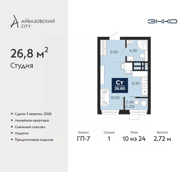 Однокомнатная квартира-студия от застройщика с предчистовой отделкой в ЖК "Айвазовский City" на 7 этаже. Общая площадь: 28 кв.м., площадь гостиной 17.1 кв.м., из которых 6.7 кв.м. выделено под кухонную зону. Все окна выходят на одну сторону. В квартире одна лоджия, один совмещенный санузел. Высота потолков 2.72 м. Дом монолитный, многоподъездный, переменной этажности, от 9 до 24 этажей. Квартира находится во 2-й секции высотой 24 этажа в корпусе ГП-7. На этаже 7 квартир. В подъезде 1 пассажирский и 2 грузовых лифта. Окончание строительства - 3 квартал 2026 года. Оформление сделки по договору долевого участия. Новый жилой район располагается в живописном месте на берегу Туры в центральной части города. Принципиально новое пространство для жизни в центре современного города для тех, чьи мечты сбываются, кто нацелен на постоянный рост, перемены к лучшему для себя и своих близких. Каждая деталь Айвазовский City вдохновляет и заряжает на новые свершения: авторская архитектура, сбалансированная продуманная инфраструктура, дизайнерские дворы со спортивными и детскими площадками, парковые зоны с фонтанами, водный канал, украшающий центральный прогулочный маршрут района и многое другое. В 2019 года проект стал лауреатом престижной премии Urban Awards 2019 в номинации "Лучший строящийся региональный жилой комплекс бизнес-класса". Главная особенность Айвазовский City - соседство разных архитектурных школ в рамках одного дома. Изысканная классика, выразительная эклектика и оригинальный модерн - жить в одном из таких домов настоящий повод для гордости. Айвазовский City это идеальное сочетание комфорта, технологий и развитой инфраструктуры. Вход в подъезд возможен с улицы и со двора. Отправляясь на работу или за покупками, жители могут выйти с внешней стороны дома, а для прогулки с ребенком со стороны двора. Экологически чистые материалы и энергосберегающие технологии, качественное освещение общественных зон, видеонаблюдение по всей территории жилого района (в том числе в подъездах, лифтах и в подземном паркинге), закрытые дворы с доступом только для жителей Айвазовский City. Часть домов в Айвазовский City будут оснащены подземным паркингом. Востребованный в нашем климатическом поясе формат хранения автомобилей защитит собственность владельца в любое время года. Аккредитация в банках: ПАО Банк "ВТБ", ПАО "Газпромбанк", "Сбербанк России", ОАО "Альфа-Банк", ПАО "Совкомбанк" и других. #zSFM73 Квартира-студия на улице Пожарных и Спасателей в городе Тюмень.