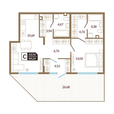 Просторная трехкомнатная квартира с предчистовой отделкой в ЖК "Беринг" на 2 этаже. Общая площадь: 71.77 кв.м., жилая: 34.49 кв.м., площадь просторной кухни-столовой: 20.75 кв.м. Квартира угловая, очень светлая, естественная вентиляция при открытии окон. В квартире один балкон, два совмещенных санузла. Высота потолков 2.72 м.