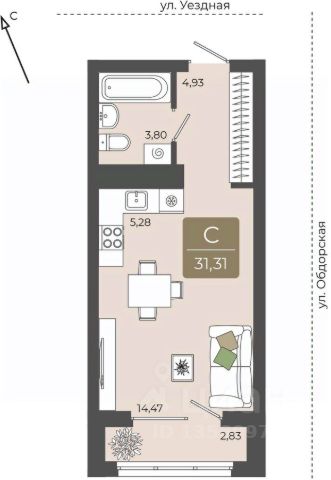 Просторная 1-комн. квартира-студия в ЖК "Мидгард на Уездной" на 11 этаже. Квартира без отделки, после оформления собственности можно делать ремонт. Общая площадь: 31.31 кв.м., площадь гостиной 19.75 кв.м., из которых 5.28 кв.м. выделено под кухонную зону. Все окна выходят на одну сторону. В квартире один балкон, один совмещенный санузел. Высота потолков 2.72 м. Дом монолитный, черырехподъездный, переменной этажности, от 9 до 15 этажей. Квартира находится в 3-й секции высотой 15 этажей в корпусе ГП-1. На этаже 8 квартир. В подъезде 1 пассажирский и 1 грузовой лифт. Окончание строительства - 3 квартал 2027 года. Оформление сделки по договору долевого участия. "Мидгард на Уездной" - современный проект комфорт-класса, расположенный на первой линии Тюменской слободы, с видом на развязку Московского тракта. Он сочетает в себе современные архитектурные решения и комфортное проживание в гармонии с природой. Жилой комплекс находится в перспективном районе, который отличается транспортной доступностью: до крупных торговых центров "Кристалл" и "Колумб" можно добраться за 10 минут, а до центра города - за 15 минут. В шаговой доступности школы, детские сады, торговые центры и парки, что делает локацию идеальной для комфортной жизни. Проектом предусмотрены дома с дизайнерскими входными зонами и планировочными решения для любого сценария жизни с возможностью включить в ипотечный платеж ремонт, мебель и технику от застройщика. Закрытый двор и собственная аллея вдоль жилого комплекса позволят насладиться тишиной вдали от суеты большого города. #zM5cdE Квартира-студия на улице Василия Подшибякина в городе Тюмень.