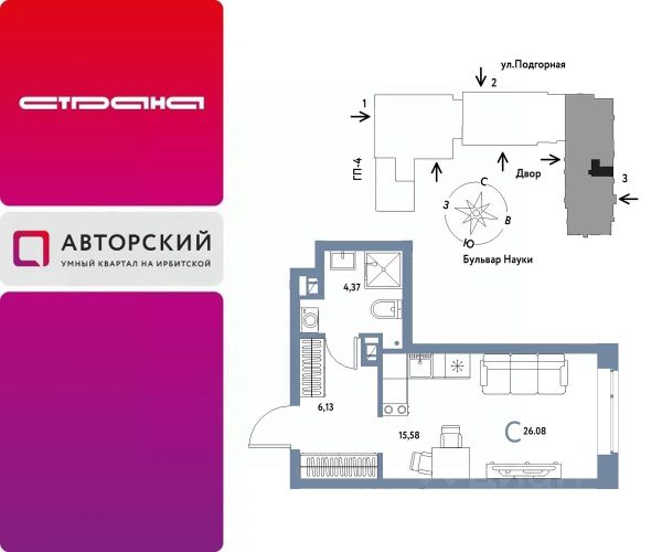 Объявление от застройщика Страна Девелопмент. Покупка квартиры защищена банком. Продается 1комнатная квартира на 6 этаже от застройщика Страна Девелопмент. Площадь квартиры 26,08 кв. м. Квартиры сдаются с предчистовой отделкой. Доступна опция "Ремонт от застройщика". В квартире внедрена технология "Умный дом". Срок сдачи 3 квартал 2025. Более подробная информация по телефону. О ПРОЕКТЕ Жилой комплекс "Авторский" — это 4 дома переменной этажности. Для них выбраны лаконичные цвета: графитовый, белый и молочно-коричневый. Динамику фасадов рисуют окна разной ширины, декоративные корзины для кондиционеров и открытые балконы разных размеров. Последние — архитектурная изюминка квартала. Отдыхайте больше на тематическом бульваре. Прямо в комплексе есть тематический бульвар для прогулок или пикников, встреч с друзьями или занятий спортом. ОТДЕЛКА Квартиры сдаются с предчистовой отделкой. Все грязные работы выполнены: произведена разводка электричества и отопления; выполнена стяжка пола; стены выровнены "под маяк". В квартире установлены розетки, выключатели и радиаторы. На входе — надежная стальная дверь. Вам остается только выбрать материалы и начать ремонт. В базовую отделку квартиры входит система "Умный дом". Вы сможете дистанционно контролировать все процессы в ней. Система будет предупреждать вас обо всех изменениях в доме с помощью мобильного приложения. РЕМОНТ Доступна опция "Ремонт от застройщика". Стоимость можно включить в ипотеку. Вы можете заказать один из трех цветовых вариантов: светлый, натуральный или тёмный. В квартире внедрена технология "Умный дом". На консультации менеджер подскажет, какие акции действуют, и как получить одобрение по ипотеке с низкой ставкой. Более подробная информация по телефону. ООО СЗ "Зеленый мыс". Проектные декларации на сайте наш.дом.рф. Купить квартиру-студию в микрорайоне Затюменка в городе Тюмень.