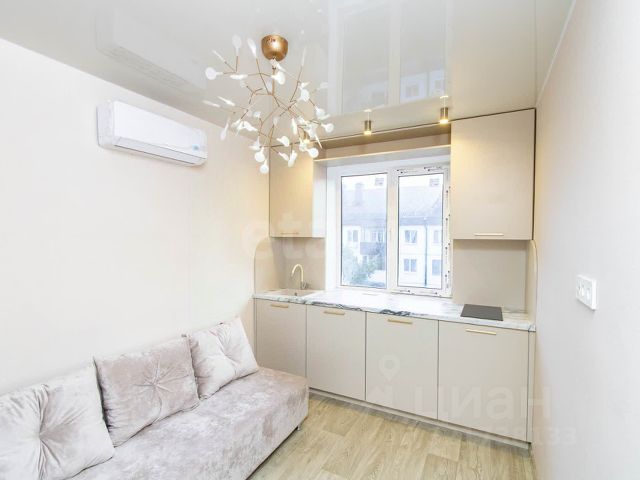 • Комната: натяжной потолок, стены выровнены, напольное покрытие — ламинат, окна пластиковые (ПВХ), отопление — алюминиевые радиаторы.