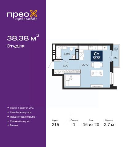 Продается однокомнатная квартира-студия от застройщика с предчистовой отделкой в ЖК "Прео" на 3 этаже. Общая площадь: 31.37 кв.м., площадь гостиной 20.16 кв.м., из которых 5 кв.м. выделено под кухонную зону. Все окна выходят на одну сторону. В квартире один балкон, один совмещенный санузел. Высота потолков 2.7 м. Квартира находится в корпусе 215. Дом монолитный, одноподъездный, высотой 20 этажей. На этаже 8 квартир. В подъезде 1 пассажирский и 1 грузовой лифт. Окончание строительства - 4 квартал 2027 года. Оформление сделки по договору долевого участия. Преображенский — один из самых привлекательных районов для жизни! Это полностью самостоятельный жилой район с точки зрения инфраструктуры. Преображенский находится между Московским и Червишевским трактами в квартале улиц Закалужская — Вьюжная — Александра Протозанова. Не нужно ждать, когда появится инфраструктура — переезжайте на всё готовое. Вблизи расположены действующие школа и детский сад. В этом году откроется еще один сад, а в следующем году — школа. По соседству с Преображенским запланировано строительство городского парка "Комарово" площадью 38 гектар. За 10 минут можно доехать на автомобиле до крупных ТРЦ: "Лента", "Кристалл", "Леруа Мерлен", "Метро" и "Ашан". С 2018 года в районе открыт Соседский центр — пространство, созданное для формирования добрососедской среды, совместного досуга, общения и реализации соседских инициатив. Здесь проходят встречи соседей, а также сами жители района организовывают мероприятия. Организатором такого события может стать любой желающий. В квартирах выполнена качественная предчистовая отделка. Гладкие стены с финишным выравниванием по маякам. Ровный потолок для установки натяжного потолка. Установлены пятикамерные окна с двойным стеклопакетом (3 стекла). Дизайнерские холлы с видеонаблюдением, безбарьерным и прозрачным входом всегда светло и спокойно. На первом этаже есть просторные колясочные, где все жители могут оставлять свои коляски и велосипеды. В Преображенском есть всё, что нужно для активного отдыха и занятий спортом. Мы сделали большое футбольное поле с безопасным покрытием. Также установили хоккейный корт, который оборудован по всем необходимым стандартам. Во дворах можно делать упражнения на специальных площадках с турниками. Весь район мы обустроили велодорожками, которые связаны в единый маршрут. У нас есть сухие фонтаны, бьющие из земли, деревья, веревки, сетки, скалодром, газон, песок и резинка — осталось просто дать своему ребенку право на свободную игру. По-настоящему хорошие дворы — это те, которые дети предпочитают соцсетям и телевизору. Аккредитация в банках: ОАО "Альфа-Банк", "Сбербанк России", ПАО "Газпромбанк", ПАО "Банк Уралсиб", ПАО Банк "ВТБ" и других. #26E8d4