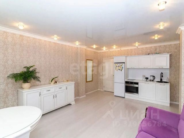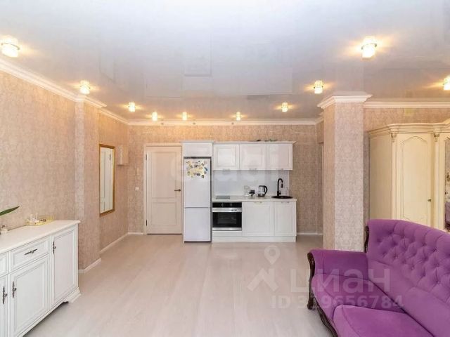 Просторная кухня правильной формы, гостиная 17, м² с окнами на две стороны и выходом на лоджию.
