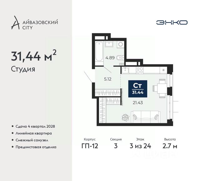 Продается 1-комн. квартира-студия с предчистовой отделкой в ЖК "Айвазовский City" на 2 этаже. Общая площадь: 31.44 кв.м., площадь гостиной 21.43 кв.м., из которых 5 кв.м. выделено под кухонную зону. Все окна выходят на одну сторону. В квартире один совмещенный санузел. Высота потолков 2.7 м. Дом монолитный, многоподъездный, высотой 24 этажа. Квартира находится в 3-й секции в корпусе ГП-12. На этаже 6 квартир. В подъезде 1 пассажирский и 1 грузовой лифт. Окончание строительства - 4 квартал 2028 года. Оформление сделки по договору долевого участия. Новый жилой район располагается в живописном месте на берегу Туры в центральной части города. Принципиально новое пространство для жизни в центре современного города для тех, чьи мечты сбываются, кто нацелен на постоянный рост, перемены к лучшему для себя и своих близких. Каждая деталь Айвазовский City вдохновляет и заряжает на новые свершения: авторская архитектура, сбалансированная продуманная инфраструктура, дизайнерские дворы со спортивными и детскими площадками, парковые зоны с фонтанами, водный канал, украшающий центральный прогулочный маршрут района и многое другое. В 2019 года проект стал лауреатом престижной премии Urban Awards 2019 в номинации "Лучший строящийся региональный жилой комплекс бизнес-класса". Главная особенность Айвазовский City - соседство разных архитектурных школ в рамках одного дома. Изысканная классика, выразительная эклектика и оригинальный модерн - жить в одном из таких домов настоящий повод для гордости. Айвазовский City это идеальное сочетание комфорта, технологий и развитой инфраструктуры. Вход в подъезд возможен с улицы и со двора. Отправляясь на работу или за покупками, жители могут выйти с внешней стороны дома, а для прогулки с ребенком со стороны двора. Экологически чистые материалы и энергосберегающие технологии, качественное освещение общественных зон, видеонаблюдение по всей территории жилого района (в том числе в подъездах, лифтах и в подземном паркинге), закрытые дворы с доступом только для жителей Айвазовский City. Часть домов в Айвазовский City будут оснащены подземным паркингом. Востребованный в нашем климатическом поясе формат хранения автомобилей защитит собственность владельца в любое время года. Аккредитация в банках: ОАО "Альфа-Банк", ПАО "Газпромбанк", ПАО Банк "ВТБ", "Сбербанк России", ПАО "Совкомбанк" и других. #ZMVguE
