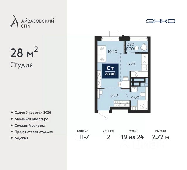 Продается 1-комн. квартира-студия от застройщика с предчистовой отделкой в ЖК "Айвазовский City" на 4 этаже. Общая площадь: 31.4 кв.м., площадь гостиной 21.3 кв.м., из которых 10.3 кв.м. выделено под кухонную зону. Все окна выходят на одну сторону. В квартире один совмещенный санузел. Высота потолков 2.7 м. Дом монолитный, многоподъездный, переменной этажности, от 14 до 24 этажей. Квартира находится в 3-й секции высотой 24 этажа в корпусе ГП-8. На этаже 7 квартир. В подъезде 1 пассажирский и 1 грузовой лифт. Окончание строительства - 3 квартал 2026 года. Оформление сделки по договору долевого участия. Новый жилой район располагается в живописном месте на берегу Туры в центральной части города. Принципиально новое пространство для жизни в центре современного города для тех, чьи мечты сбываются, кто нацелен на постоянный рост, перемены к лучшему для себя и своих близких. Каждая деталь Айвазовский City вдохновляет и заряжает на новые свершения: авторская архитектура, сбалансированная продуманная инфраструктура, дизайнерские дворы со спортивными и детскими площадками, парковые зоны с фонтанами, водный канал, украшающий центральный прогулочный маршрут района и многое другое. В 2019 года проект стал лауреатом престижной премии Urban Awards 2019 в номинации "Лучший строящийся региональный жилой комплекс бизнес-класса". Главная особенность Айвазовский City - соседство разных архитектурных школ в рамках одного дома. Изысканная классика, выразительная эклектика и оригинальный модерн - жить в одном из таких домов настоящий повод для гордости. Айвазовский City это идеальное сочетание комфорта, технологий и развитой инфраструктуры. Вход в подъезд возможен с улицы и со двора. Отправляясь на работу или за покупками, жители могут выйти с внешней стороны дома, а для прогулки с ребенком со стороны двора. Экологически чистые материалы и энергосберегающие технологии, качественное освещение общественных зон, видеонаблюдение по всей территории жилого района (в том числе в подъездах, лифтах и в подземном паркинге), закрытые дворы с доступом только для жителей Айвазовский City. Часть домов в Айвазовский City будут оснащены подземным паркингом. Востребованный в нашем климатическом поясе формат хранения автомобилей защитит собственность владельца в любое время года. Аккредитация в банках: ПАО Банк "ВТБ", ПАО "Газпромбанк", "Сбербанк России", ОАО "Альфа-Банк", ПАО АКБ "Абсолют Банк" и других. #ZmsF9t