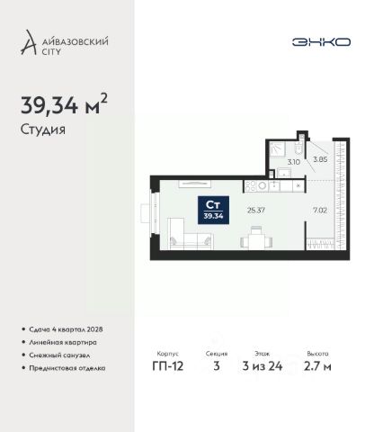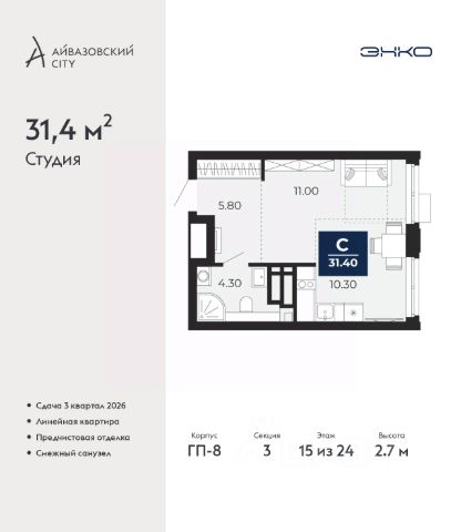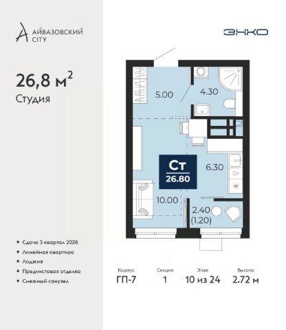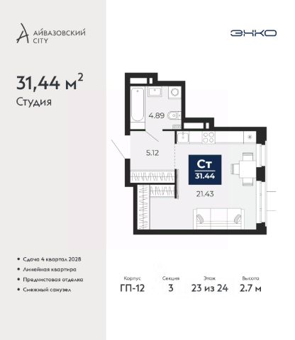 Продается 1-комн. квартира-студия с предчистовой отделкой в ЖК "Айвазовский City" на 2 этаже. Общая площадь: 31.44 кв.м., площадь гостиной 21.43 кв.м., из которых 5 кв.м. выделено под кухонную зону. Все окна выходят на одну сторону. В квартире один совмещенный санузел. Высота потолков 2.7 м. Дом монолитный, многоподъездный, высотой 24 этажа. Квартира находится в 3-й секции в корпусе ГП-12. На этаже 6 квартир. В подъезде 1 пассажирский и 1 грузовой лифт. Окончание строительства - 4 квартал 2028 года. Оформление сделки по договору долевого участия. Новый жилой район располагается в живописном месте на берегу Туры в центральной части города. Принципиально новое пространство для жизни в центре современного города для тех, чьи мечты сбываются, кто нацелен на постоянный рост, перемены к лучшему для себя и своих близких. Каждая деталь Айвазовский City вдохновляет и заряжает на новые свершения: авторская архитектура, сбалансированная продуманная инфраструктура, дизайнерские дворы со спортивными и детскими площадками, парковые зоны с фонтанами, водный канал, украшающий центральный прогулочный маршрут района и многое другое. В 2019 года проект стал лауреатом престижной премии Urban Awards 2019 в номинации "Лучший строящийся региональный жилой комплекс бизнес-класса". Главная особенность Айвазовский City - соседство разных архитектурных школ в рамках одного дома. Изысканная классика, выразительная эклектика и оригинальный модерн - жить в одном из таких домов настоящий повод для гордости. Айвазовский City это идеальное сочетание комфорта, технологий и развитой инфраструктуры. Вход в подъезд возможен с улицы и со двора. Отправляясь на работу или за покупками, жители могут выйти с внешней стороны дома, а для прогулки с ребенком со стороны двора. Экологически чистые материалы и энергосберегающие технологии, качественное освещение общественных зон, видеонаблюдение по всей территории жилого района (в том числе в подъездах, лифтах и в подземном паркинге), закрытые дворы с доступом только для жителей Айвазовский City. Часть домов в Айвазовский City будут оснащены подземным паркингом. Востребованный в нашем климатическом поясе формат хранения автомобилей защитит собственность владельца в любое время года. Аккредитация в банках: ПАО Банк "ВТБ", ПАО "Газпромбанк", "Сбербанк России", ОАО "Альфа-Банк", АО "ДОМ.РФ" и других. #z6V9UE