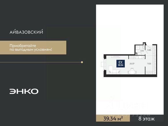 1-комн. квартира-студия с предчистовой отделкой в ЖК "Айвазовский" на 6 этаже. Общая площадь: 29.1 кв.м., площадь гостиной 17.1 кв.м., из которых 6.7 кв.м. выделено под кухонную зону. Все окна выходят на одну сторону. В квартире одна лоджия, один совмещенный санузел. Высота потолков 2.72 м. Дом монолитный, многоподъездный, переменной этажности, от 9 до 24 этажей. Квартира находится во 2-й секции высотой 24 этажа в корпусе ГП-7. На этаже 7 квартир. В подъезде 1 пассажирский и 2 грузовых лифта. Окончание строительства - 3 квартал 2026 года. Оформление сделки по договору долевого участия. Новый жилой район располагается в живописном месте на берегу Туры в центральной части города. Принципиально новое пространство для жизни в центре современного города для тех, чьи мечты сбываются, кто нацелен на постоянный рост, перемены к лучшему для себя и своих близких. Каждая деталь ЖК "Айвазовский" вдохновляет и заряжает на новые свершения: авторская архитектура, сбалансированная продуманная инфраструктура, дизайнерские дворы со спортивными и детскими площадками, парковые зоны с фонтанами, водный канал, украшающий центральный прогулочный маршрут района и многое другое. В 2019 года проект стал лауреатом престижной премии Urban Awards 2019 в номинации "Лучший строящийся региональный жилой комплекс бизнес-класса". Главная особенность Айвазовский - соседство разных архитектурных школ в рамках одного дома. Изысканная классика, выразительная эклектика и оригинальный модерн - жить в одном из таких домов настоящий повод для гордости. Айвазовский это идеальное сочетание комфорта, технологий и развитой инфраструктуры. Вход в подъезд возможен с улицы и со двора. Отправляясь на работу или за покупками, жители могут выйти с внешней стороны дома, а для прогулки с ребенком со стороны двора. Экологически чистые материалы и энергосберегающие технологии, качественное освещение общественных зон, видеонаблюдение по всей территории жилого района (в том числе в подъездах, лифтах и в подземном паркинге), закрытые дворы с доступом только для жителей Айвазовский. Часть домов в Айвазовский будут оснащены подземным паркингом. Востребованный в нашем климатическом поясе формат хранения автомобилей защитит собственность владельца в любое время года. Аккредитация в банках: ПАО Банк "ВТБ", "Сбербанк России", ПАО "Газпромбанк", ОАО "Альфа-Банк", АО "ДОМ.РФ" и других. Продам квартиру-студию квартир-студий в Айвазовский в Тюмени.